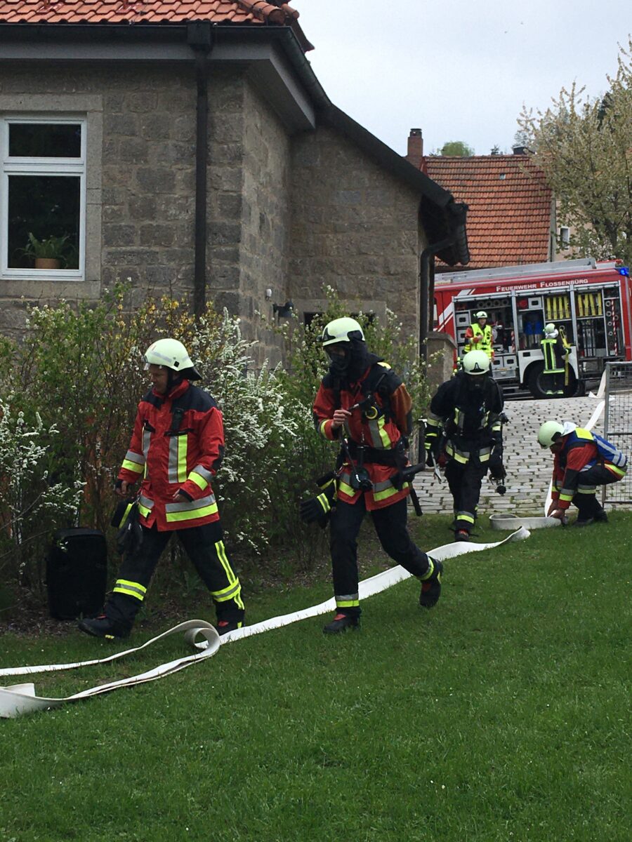 Nach der Alarmierung der Feuerwehr heulten sogleich die Sirenen und die Feuerwehren erreichten mit lautem „Tatütata“ aus Flossenbürg sowie Altenhammer den katholischen Kindergarten St. Franziskus. Die Feuerwehrmänner rückten aus, rollten Schläuche aus, schlossen diese an den Verteiler und dann kam der Befehl „Wasser Marsch“ um den Brand zu löschen.