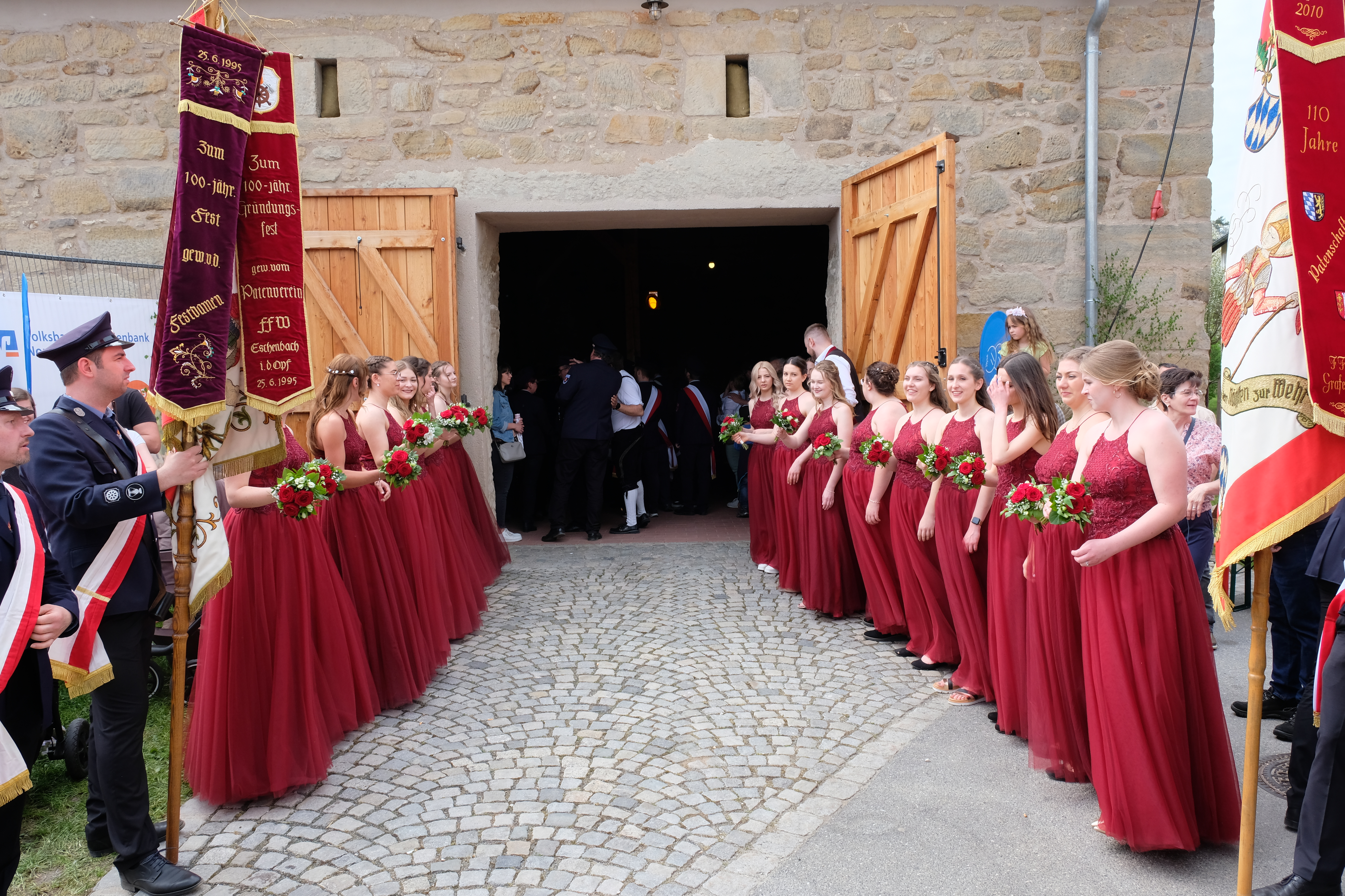 Vor dem Eingang zum Kulturstadel standen dann die Festdamen in ihren eleganten Jubiläums-Outfits noch einmal Spalier und umjubelten die Festzug-Teilnehmer. Damit war für die charmante Damen-Mannschaft das Fest noch lange nicht gelaufen. Auf sie wartete die dankbare Aufgabe, Festorden zu verteilen und die Ehrengäste zu einem Löscheinsatz in die Bar zu locken.