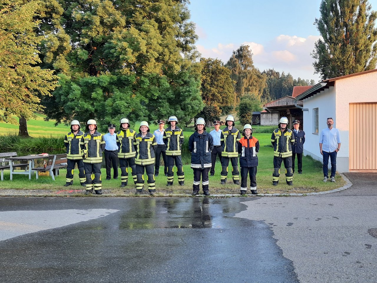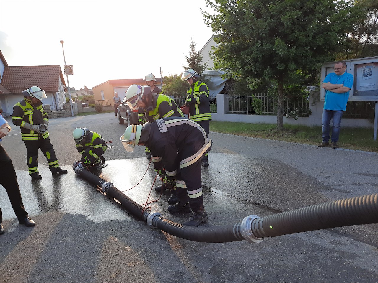 Denn für den besagten Nachmittag war Dauerregen angekündigt und deshalb nicht sicher, ob die Prüfung stattfinden kann, und wenn ja, ob sie unter den erschwerten Bedingen auch bestanden wird. Aber am frühen Abend reißen die Wolken auf, die Gruppe kann bei trockener Witterung zeigen, dass sie mit einem Hydranten umgehen kann.