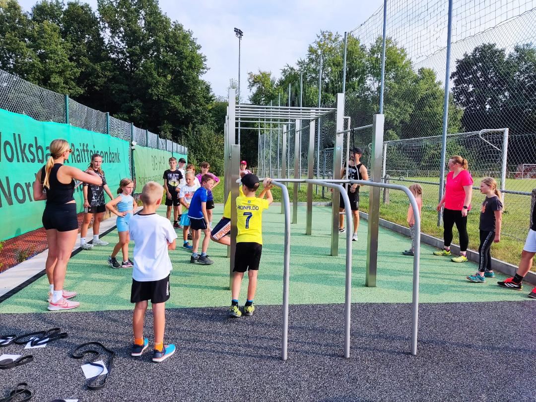 Mit Unterstützung von den langjährigen Calisthenics-Profis und Wahl-Vorbachern Johannes Hartmann und Stefan Schnerch konnten die Kinder verschiedene Übungen an der neuen Anlage ausprobieren. Die Palette reichte dabei von einfachen Beweglichkeitsübungen bis hin zu kleinen Kraft- und Koordinations-Challenges mit und ohne Unterstützung von Gummibändern. Auch viele Übungen nur mit dem eigenen Körpergewicht zeigten die erfahrenen Sportler den Teilnehmern. Bei allem stand nicht der sportliche Ehrgeiz im Vordergrund, sondern die Freude an der Bewegung und das gemeinsame Erleben. „Die Übungen an den Stangen und mit dem Eigengewicht machen echt Spaß und gehen ganz schön auf die Muskeln“, lautete das Fazit einiger Jungs. Und andere meinten: „Cool, dass uns jemand mal gezeigt hat, was man hier alles machen kann.“