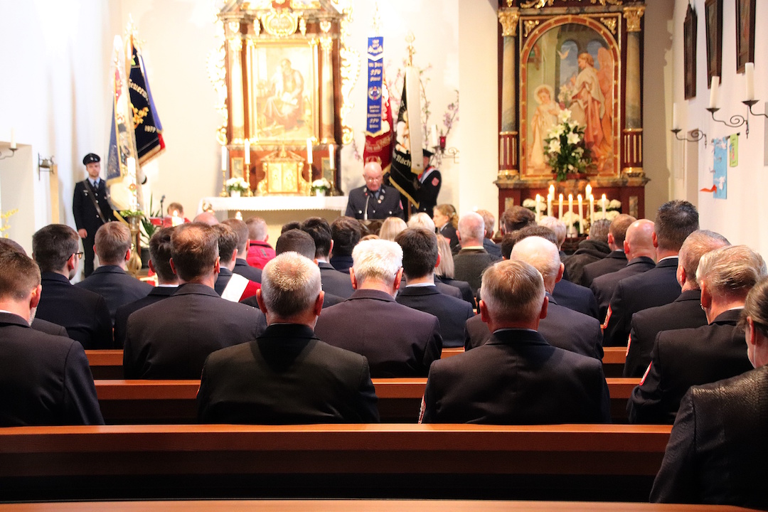 Abordnungen der Feuerwehren aus Hütten, Grafenwöhr, Gmünd und Gößenreuth mit Bürgermeister Edgar Knobloch und Vertretern des Stadtrates trafen sich zum Marsch in die Kirche. Begleitet wurde der Zug von der Stadtkapelle Grafenwöhr.