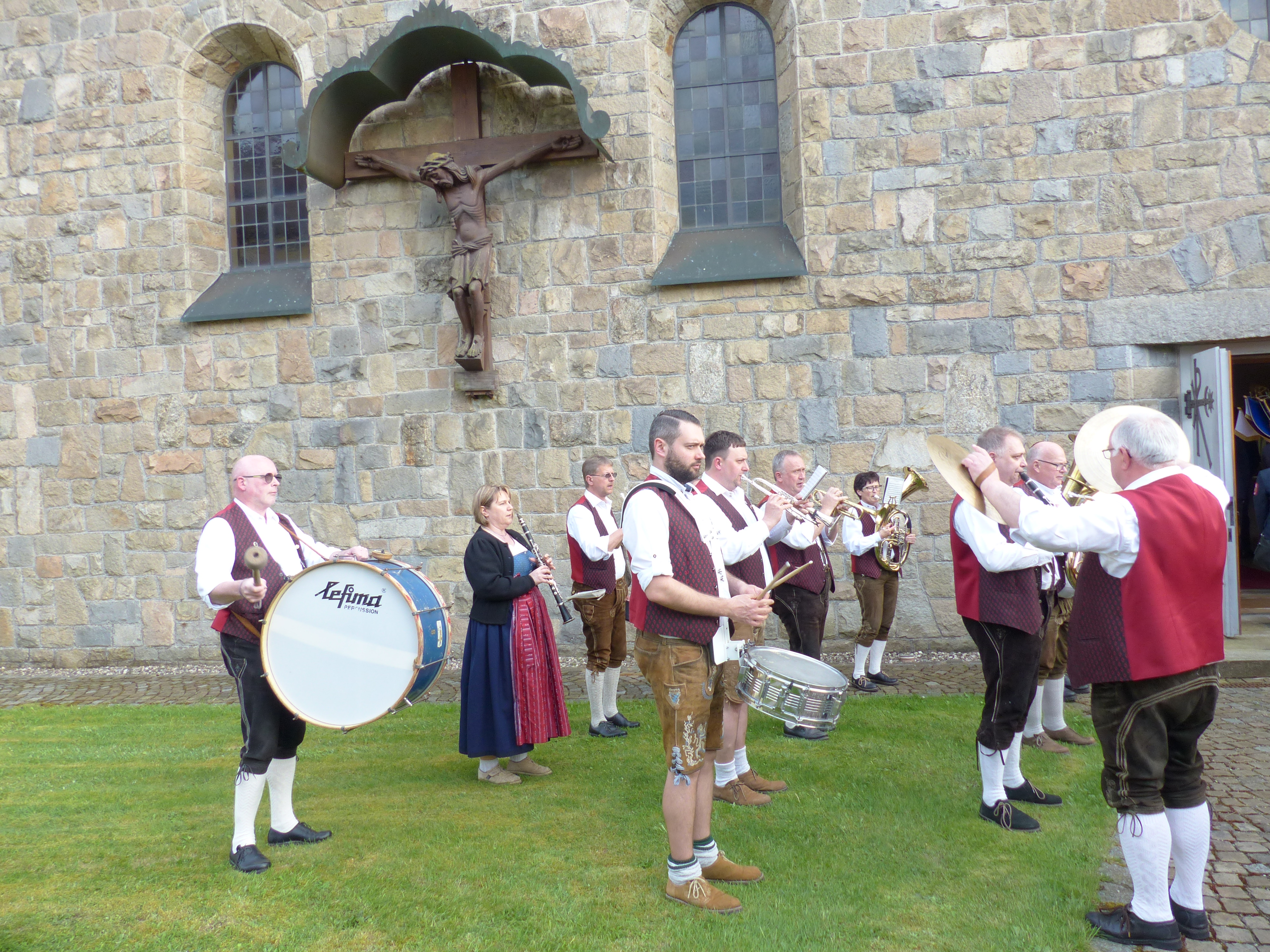 Über 80 Feuerwehrfrauen und -männer in Uniform hatten sich hinter ihrer jeweiligen Fahne versammelt, um den Kirchenzug anzuführen. Die Stadtkapelle spielte voraus und im Anschluss die einladende Wehr Lerau mit Bürgermeister Anton Kappl und Vizebürgermeister Karl Liegl, die hier auch Mitglieder sind, die FFW Wittschau-Preppach, FFW Leuchtenberg und FFW Döllnitz.