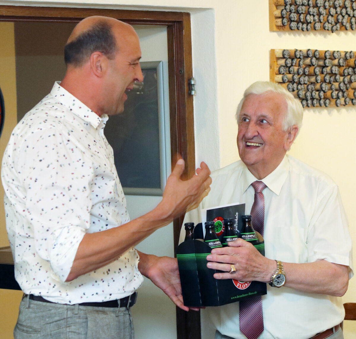 Mit einem Sechser-Tragerl Flosser „Brauhaus-Bier“ bedankte sich CSU-Ortsverbandsvorsitzender Harald Gollwitzer beim ehemaligen Bürgermeister Fred Lehner für dessen kurzweiligen Vortrag. Fotos: Stephan Landgraf