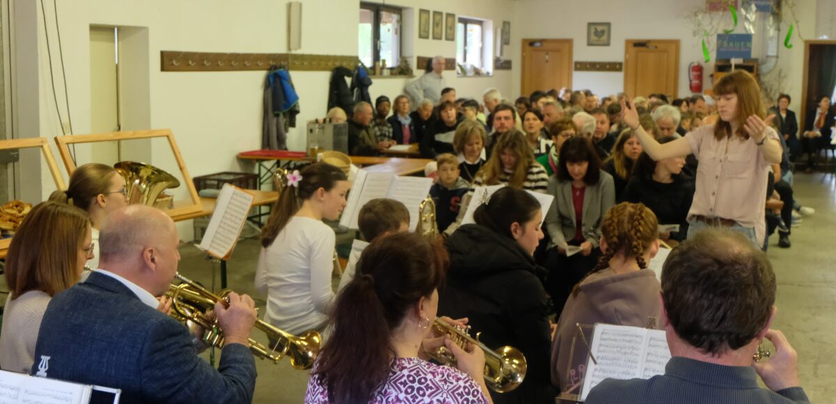 Ein kleiner Altar war in der festlich geschmückten Kleintierhalle errichtet, und mit dem Lied “Geh aus mein Herz und suche Freud” wurde der Gottesdienst eröffnet. In seiner Predigt unter dem Motto “Wo ist Gott – Ah, da ist er ja”, erinnerte Pfarrer Römischer an die Wichtigkeit des Glaubens und der Gemeinschaft. Der Posaunenchor, unter der Leitung von Tanja Riedel, und die Kirchenband begleiteten den Gottesdienst musikalisch.