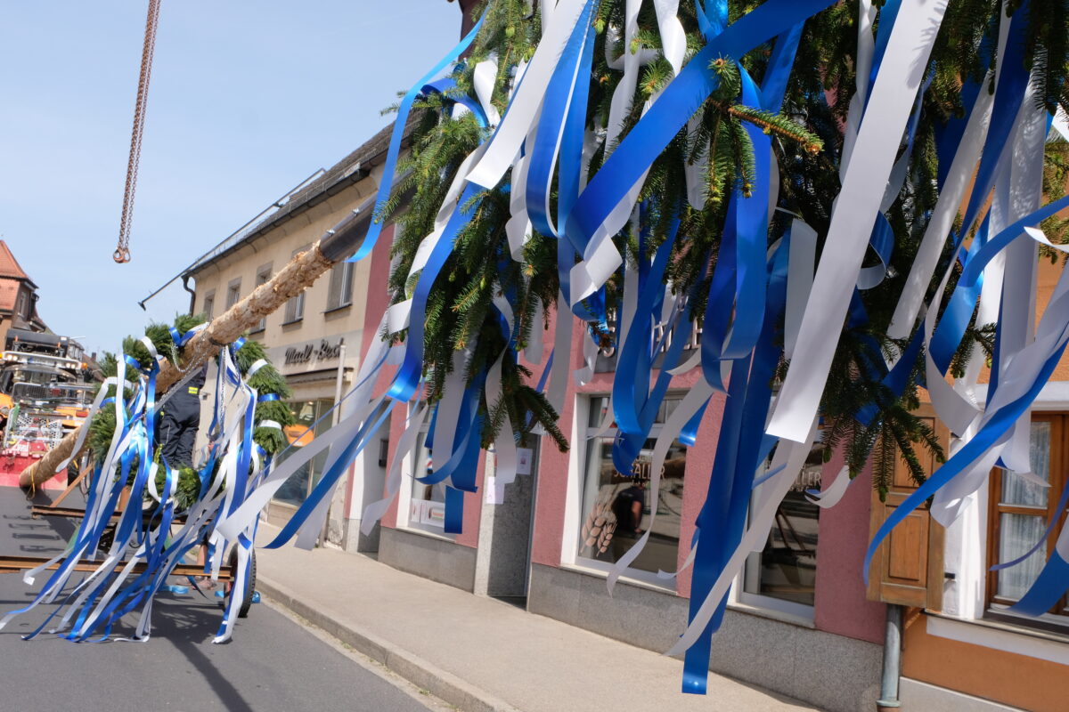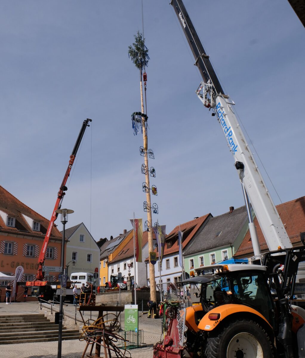 Um allen Gefahren aus dem Weg zu gehen, wurde der Baum einen Tag vorher aus dem Wald geholt und am neuen Feuerwehrgerätehaus gelagert, wo er bis auf die Krone durch die Jungfeuerwehr entrindet wurde. Problemlos verlief der Transport des 27 Meter langen Baums vom Gerätehaus in der Plößberger Straße direkt in das Marktzentrum. Viele Schaulustige, darunter eine große Kinderschar, hatten sich derweil ein Stelldichein in der Marktplatzanlage gegeben. Dort waren zahlreiche Verkaufsstände aufgebaut und warteten auf interessierte Käufer.