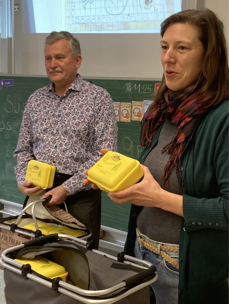 Gemeinsam mit dem ersten Vorstand Wilhelm Weiß kam Waldeck in die Schule und übergab den Kindern der ersten Klasse die gelben Brotdosen, gefüllt mit Zutaten aus regionalem, ökologischem Anbau. Den Kindern erklärte sie, dass ein gesundes Frühstück lange satt mache, fit halte und beim Lernen unterstütze.