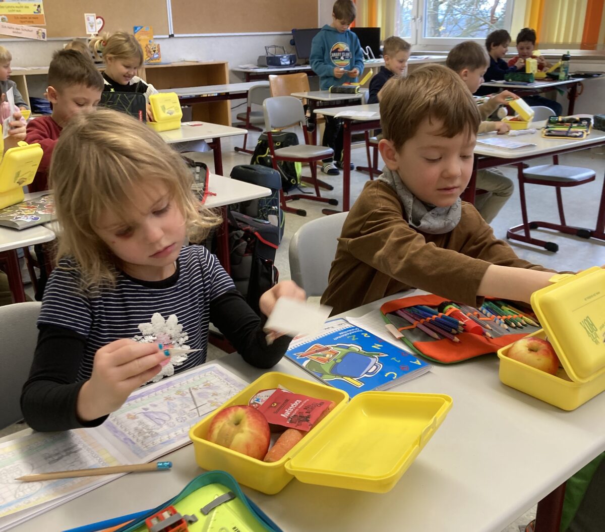 Zur Pausenkultur an der Etzenrichter Grundschule gehört eine fünfzehnminütige Bewegungspause im Schulhof. Danach essen die Kinder im Klassenzimmer, am Tisch sitzend, ihre Brotzeit.