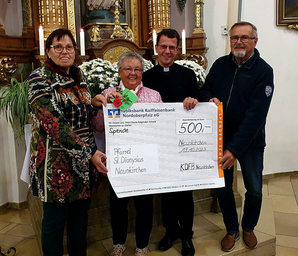 Die Frauenbund-Vorsitzende der Pfarrei St. Dionysius Neunkirchen Regina Völkl hat mit ihrer Vorstandschaft zahlreiche Veranstaltungen über das Jahr gehalten. Dabei sammelten sich auch einige Euros im Spendensäckl an. Zusammen haben sie beratschlagt, wem diese zufließen sollten. Regina Völkl übergab nun mit Schatzmeisterin Antonie Kindl an Pfarrer Thomas Kohlhepp und Kirchenpfleger Willi Fuchs eine Spende über 500 Euro. Über