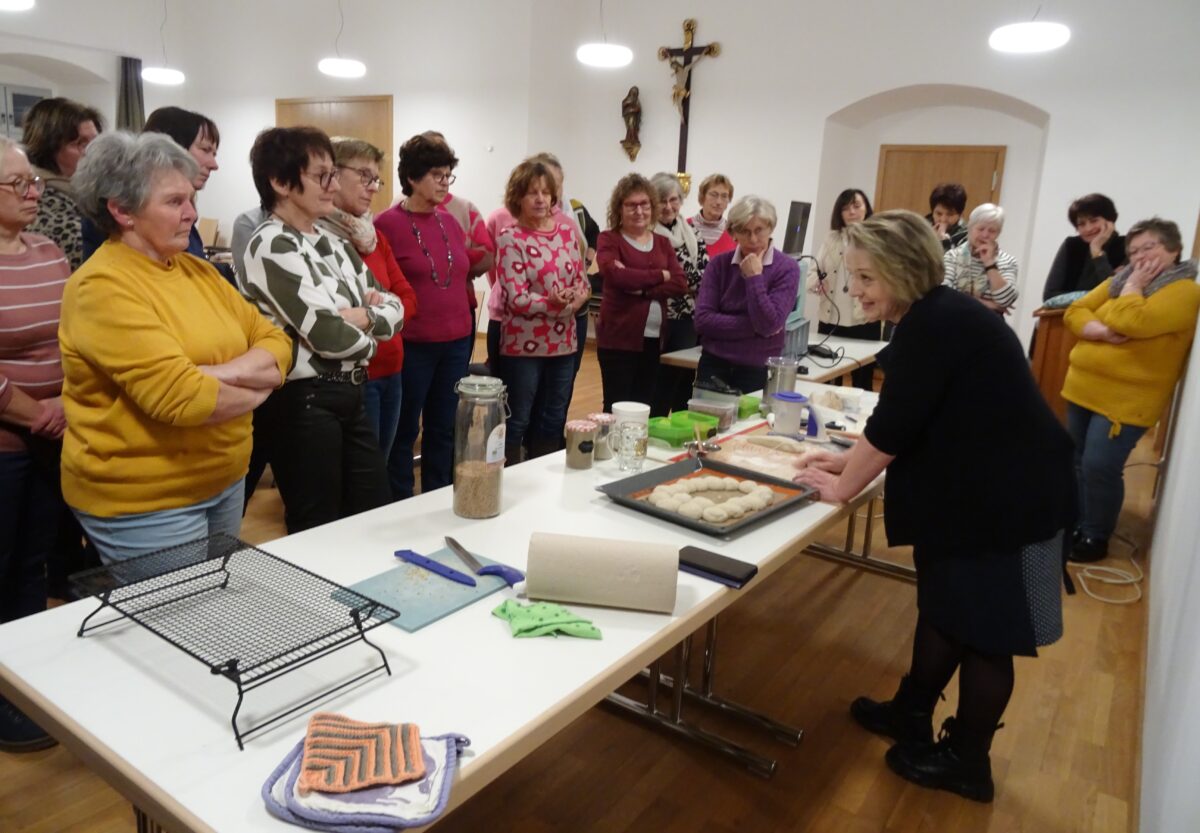 30 Frauen waren ins Pfarrheim gekommen, um mit Hauswirtschaftsmeisterin Silvia Mauermaier die ersten Schritte in Richtung selbstgebackenes Brot zu gehen. “Warum Brot selbst backen?” so die Referentin, “weil es Spaß macht.”