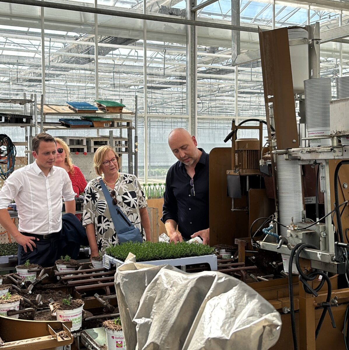 Technische Lösungen wie die Topfmaschine und fahrbare Pflanztische, auf denen die Pflanzen von unten bewässert werden, unterstützen die Gärtner bei der Arbeit. Die Besucher zeigten sich beeindruckt von der Konzeption und vom Engagement der Unternehmerfamilie.