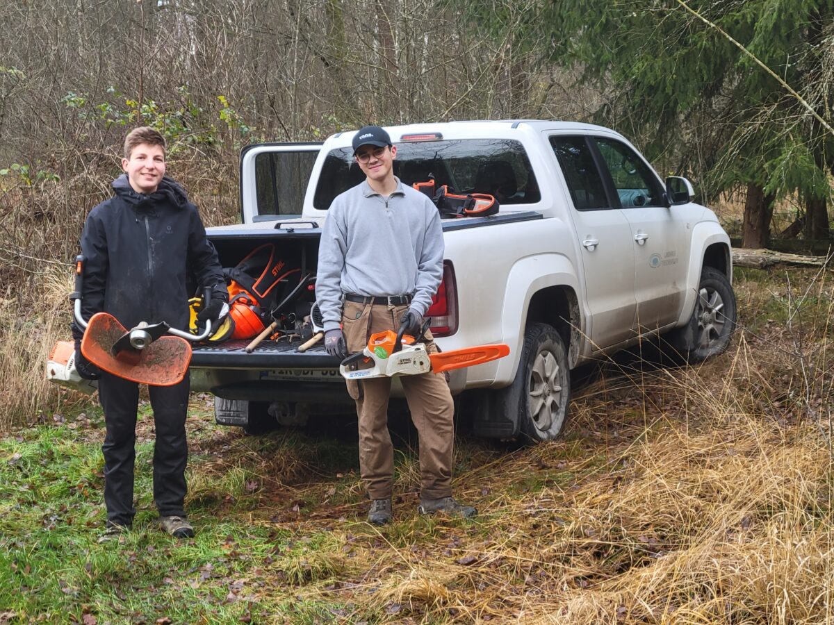 Nach einer anfänglichen Einarbeitungsphase konnten die beiden unter Anleitung und Betreuung bereits viele Einblicke in die zahlreichen Aufgaben des Naturschutzes am Landratsamt gewinnen. In diesen ersten 3 Monaten haben sie außerdem bereits einen Motorsägen-Kurs besucht und den Umgang mit der Motorsense erlernt.