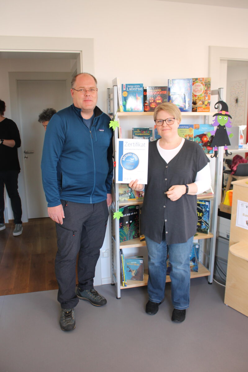 Eine Auszeichnung hatte sich auch die Bibliothek selbst verdient: Für die Erfüllung aller 15 relevanten Bewertungskriterien wie etwa Benutzerorientiertheit von Medienangebot und Öffnungszeiten, attraktives Veranstaltungsangebot, zweckmäßige und benutzergerechte räumliche Gegebenheiten oder stetige Fortbildung der Mitarbeiter verlieh der katholische Sankt-Michaels-Bund, der Bibliotheken bei Bestandsentwicklung und Organisation unterstützt, der Gemeindebücherei das Büchereisiegel 2024/25 in Gold.