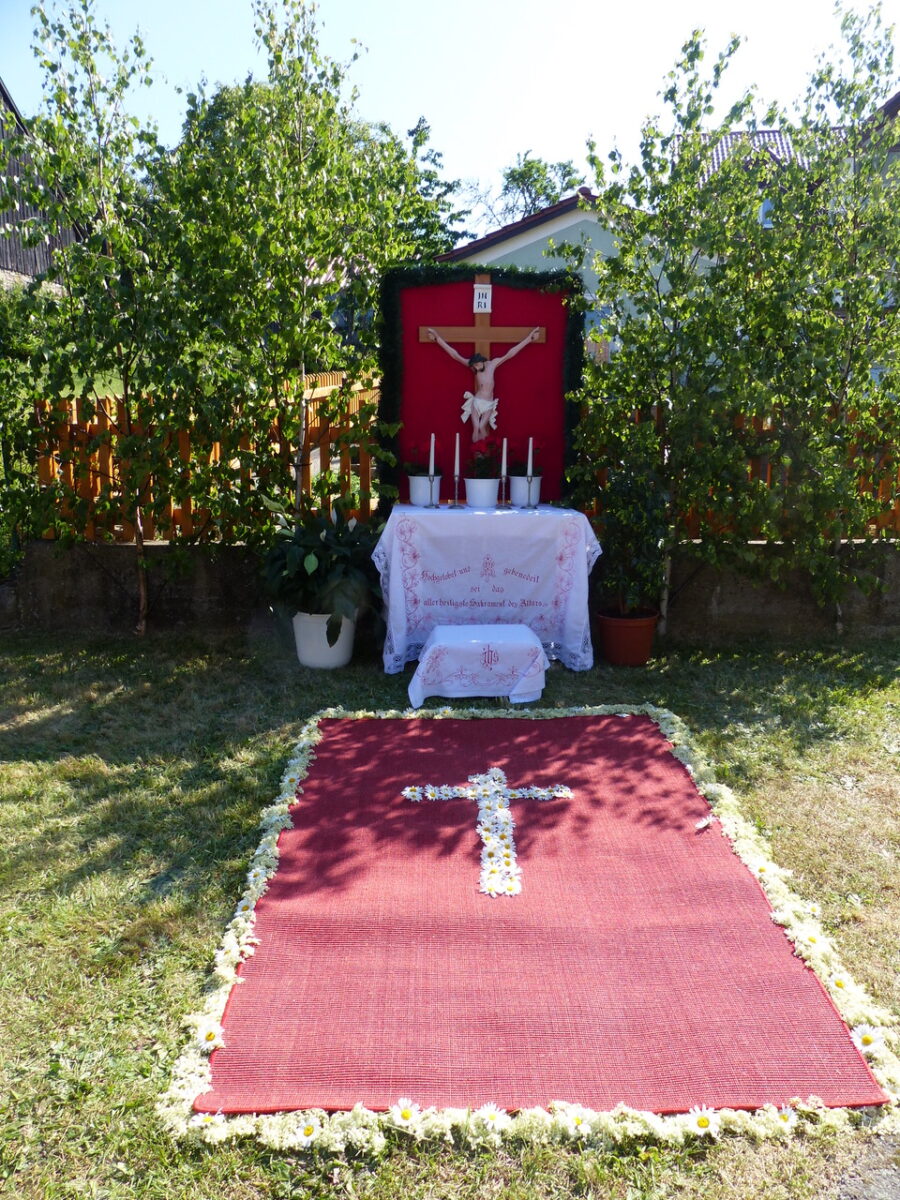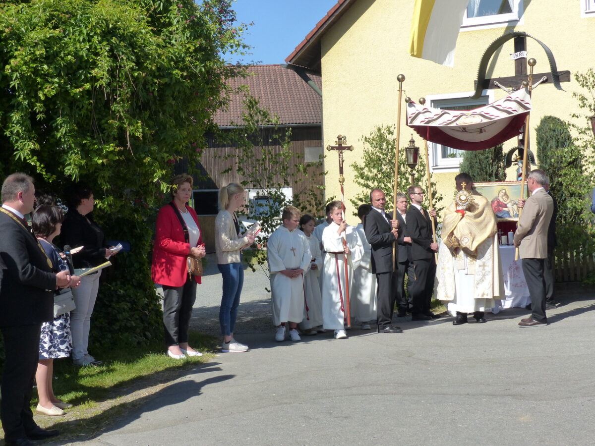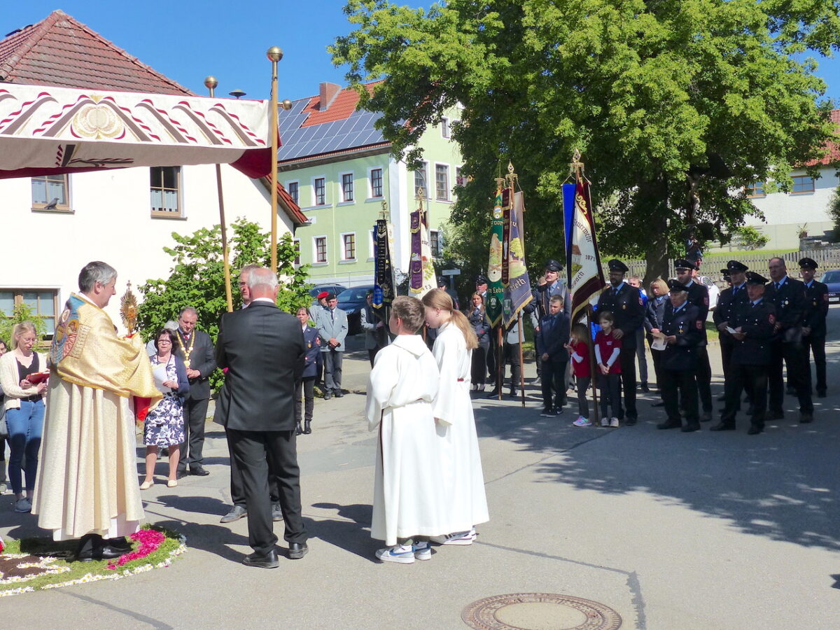 Nach der Messfeier im Gotteshaus zog Pfarrer Adam Nieciecki unter dem Baldachin, im Volksmund „Himmel“, durch das Dorf zu den vier hergerichteten Altären, Bäumler, Saller, Simon und Schärtl/Wittmann. Vier deswegen, weil damit alle vier Himmelsrichtungen berücksichtigt werden.