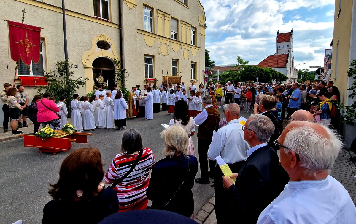 Die Gerhardinger Schulschwestern bauten als dankbare Erinnerung an das 130-jährige Wirken zum letzten Mal den Altar auf. Am Eingang des Klosters stellten die Pfadfinder die getragene Monstranz ab. Pfarrer Markus Schmid mit Kaplan Wolfgang Weyer beteten vor der Monstranz, die Erstkommunionkinder sprachen die Fürbitten. Nach dem Segen mit der Monstranz, ging Markus Schmid zu den anwesenden drei Schwestern. Er dankte und kniete gar vor der Seniorin Celia, sie ist über 80 Jahre und würdigte die jahrzehntelange Leistung, auch für den Aufbau des Altares zum Abschied. Im Herbst werden auch sie Weiden verlassen.
