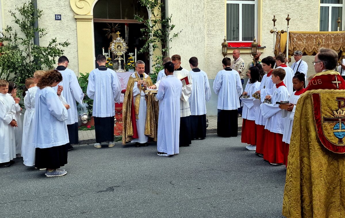 Fronleichnam ist ein Hochfest in der katholischen Kirche. Das Fest wird immer am zweiten Donnerstag nach Pfingsten gefeiert. Im Mittelpunkt steht das geweihte Brot, die sogenannte Hostie, als Symbol für die Gegenwart Christi. Fronleichnam ist das „Hochfest des Leibes und Blutes Jesu Christi“. Nach der Feier der Eucharistie mit dem Chor im Kirchenschiff begann die Prozession in der Hermannstraße am ersten Altar.