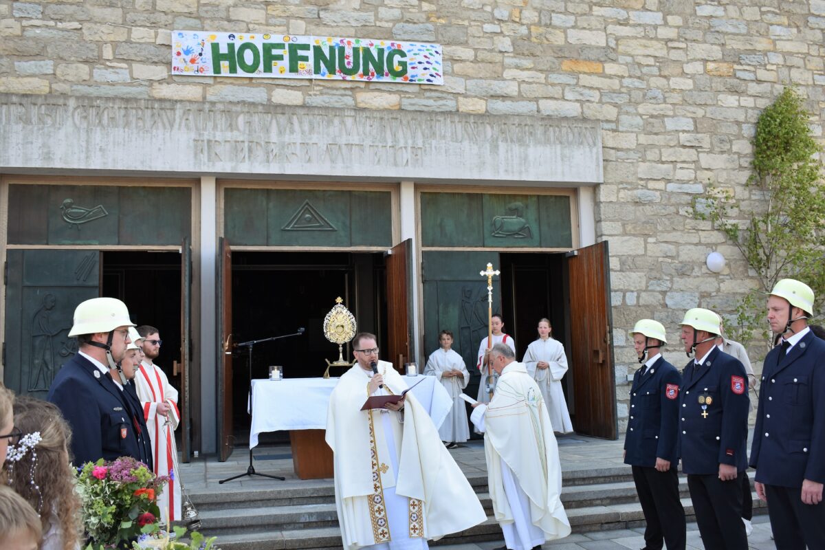 Nach dem Schlusssegen vor der Friedenskirche, bedankte sich Pfarrer Fenk bei allen, die mithalfen, das Fronleichnamsfest zu begehen. Seinen besonderen Dank richtete er an die Freiwillige Feuerwehr, die den Verkehr regelte und dem BRK sowie dem Katholischen Frauenbund. Einige der Frauen machten sich um 5 Uhr früh an die Arbeit und legten dort einen wunderschönen Blumenteppich. Anschließend gab es einen Frühschoppen im Jugendheimgarten.