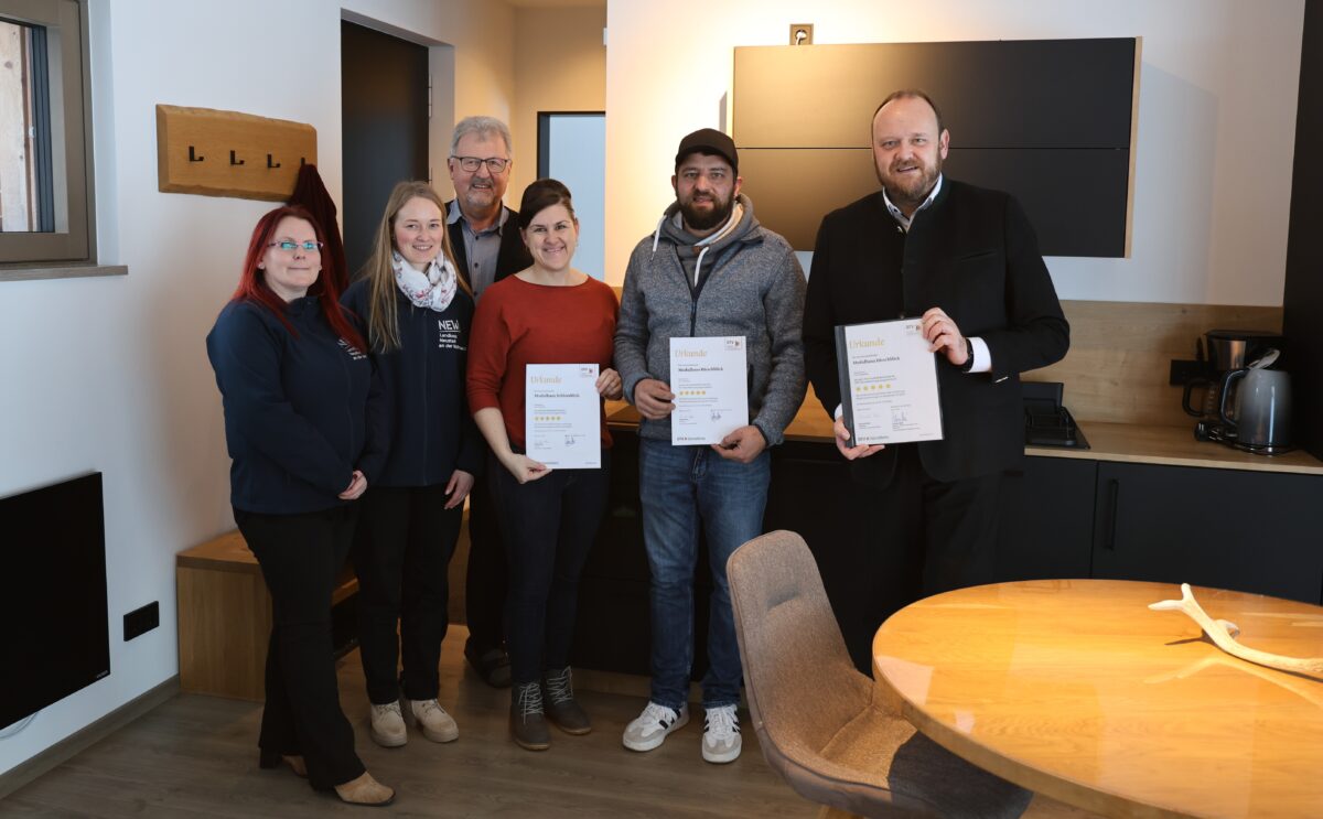 Anlass zur Freude bei Familie Maurer in Neuenhammer bei Georgenberg. Am 28. Januar 2026 wurde die fünf-Sterne-Klassifizierung des Deutschen Tourismusverbandes (DTV) für die beiden Modulhäuser „Hirschblick“ und „Schlossblick“ offiziell bestätigt. Zur Übergabe und Gratulation kamen Landrat Andreas Meier sowie Christina Kircher und Lisa Vater vom Tourismusbüro des Landkreises. Vor Ort begrüßten Christine und Johannes Maurer die Gäste; auch Seniorchef Johann Maurer war anwesend.