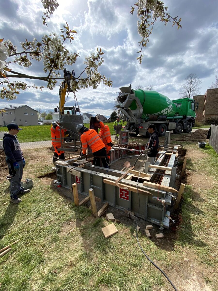„Learning by doing“ lautete das Motto, so dass die vier Jugendlichen bei allen Arbeiten selbst Hand anlegen durften. Baggern, Systemschalung aufbauen und sichern, dabei die Einführung für Wasser- und Stromleitung nicht vergessen und vieles mehr. Als der Betonmischer anrückte, wurde das Projekt noch greifbarer und realer. Nach der nötigen Härtungsphase bauten die Schüler zusammen mit den Kassecker-Mitarbeitern und -Auszubildenden den Bausatz aus Metallprofilen sowie Stegplatten auf.