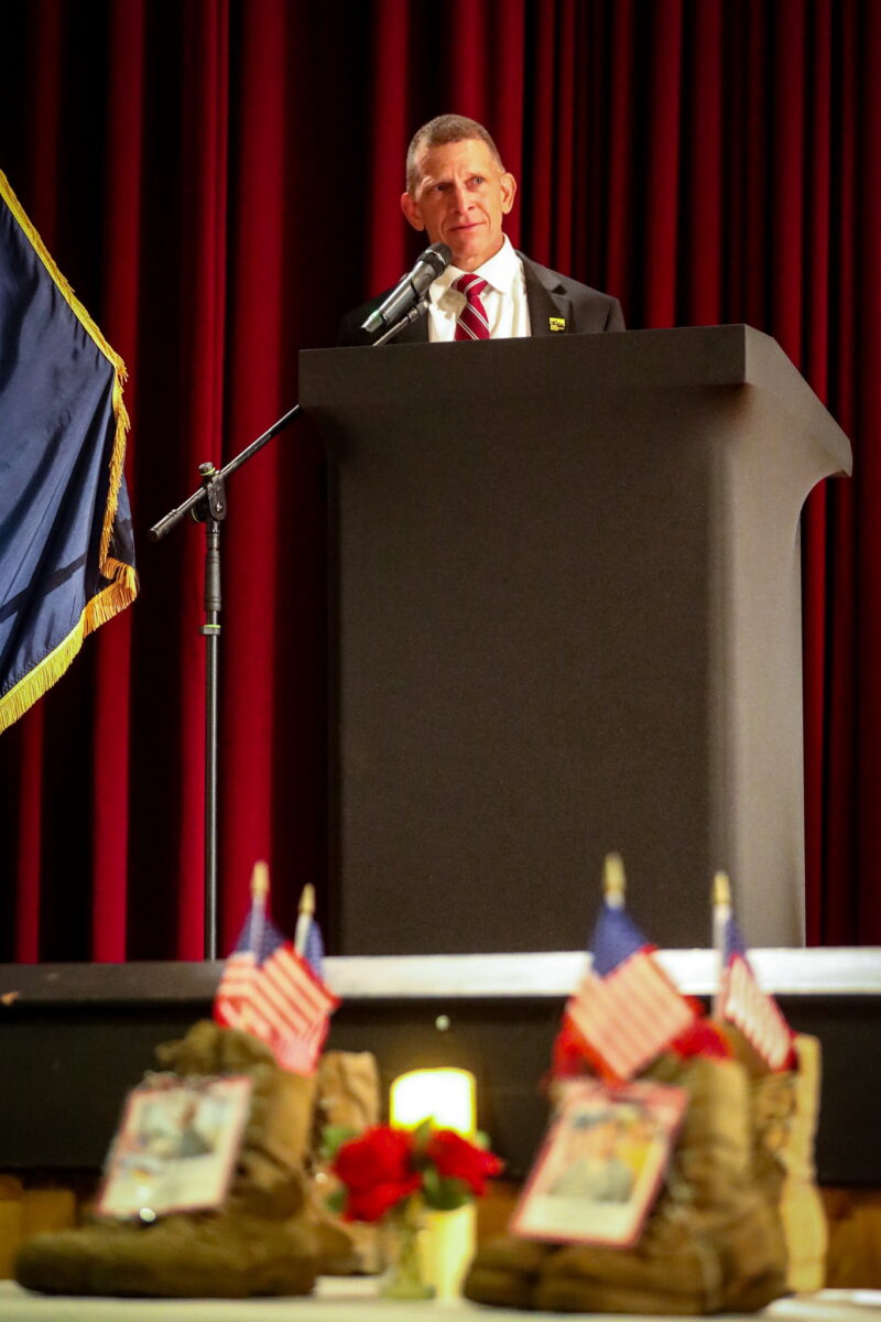 Gastredner der Zeremonie war Michael A. Grinston, der 16. Sergeant Major der US Army. Der Ruhestands-Sergeant Major blendete auf seine persönlichen Erinnerungen an den 11. September 2001 zurück. Er gedachte den Opfern, die beim Terroranschlag und in den nachfolgenden militärischen Einsätzen ihr Leben verloren haben und drückte den Familien ihr Mitgefühl aus. „Gold Star Families“, Angehörige von gefallenen Soldaten aus dem Standort hatten dazu in der ersten Reihe Platz genommen, Bilder der Soldaten waren vor deren Stiefelpaaren aufgestellt. Grinston warnte davor, dass täglich Anschläge passieren können, er forderte auf, einsatzbereit zu sein und durch Führung im Militär und bei den Einsatzkräften Stärke zu zeigen.