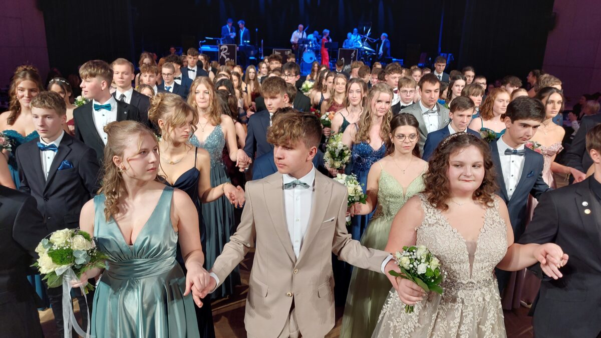 Bevor die “Richard Wagner Live Combo” zur Polonaise ansetzte und die Tanzpaare in zwei Gruppen in den Gust-Lang-Saal einzogen, blickte Tanzpädagogin Claudia Höllriegl auf die gemeinsame Kurszeit zurück. Die Neuntklässlerinnen und Neuntklässler vom Kepler-Gymnasium, Augustinus-Gymnasium und Elly-Heuss-Gymnasium hätten mit großem Engagement trainiert. Ihr Dank galt den Vortänzern Nils Pollhammer, Jonas Kaiser und Louis Gebhardt sowie jenen Schülern, die als Tanzpartner eingesprungen waren.