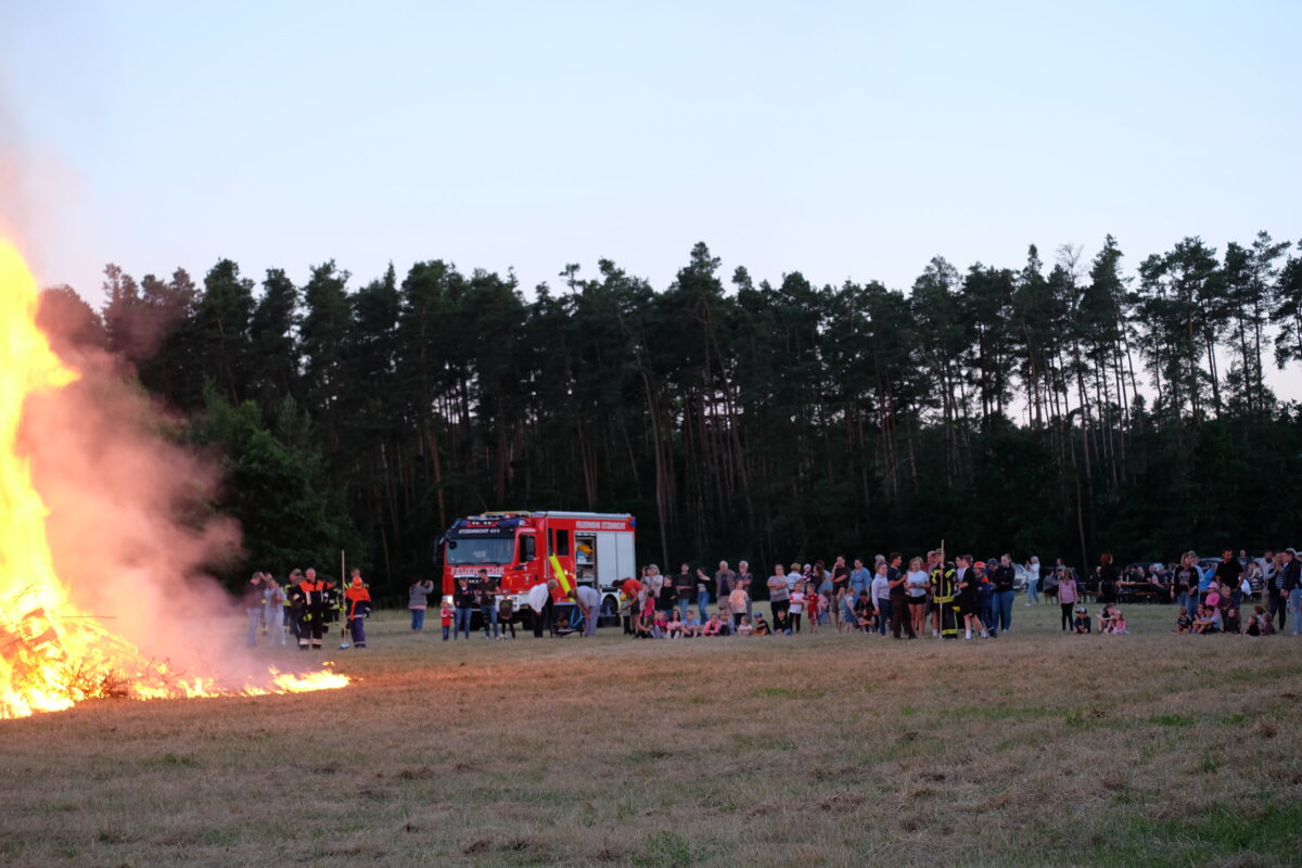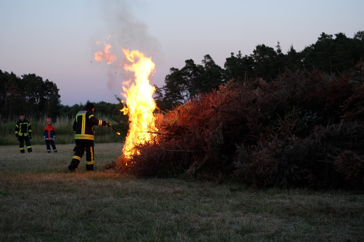 Nach Sonnenuntergang beobachteten die Gäste und vor allem die Kids, als Kommandant Michael Roith das Feuer kontrolliert entzündete. Die Feuerwehr passte genau auf, dass niemand dem Feuer zu nahe kam. Anschließend konnten die Flammen wunderbar in den Nachthimmel züngeln.