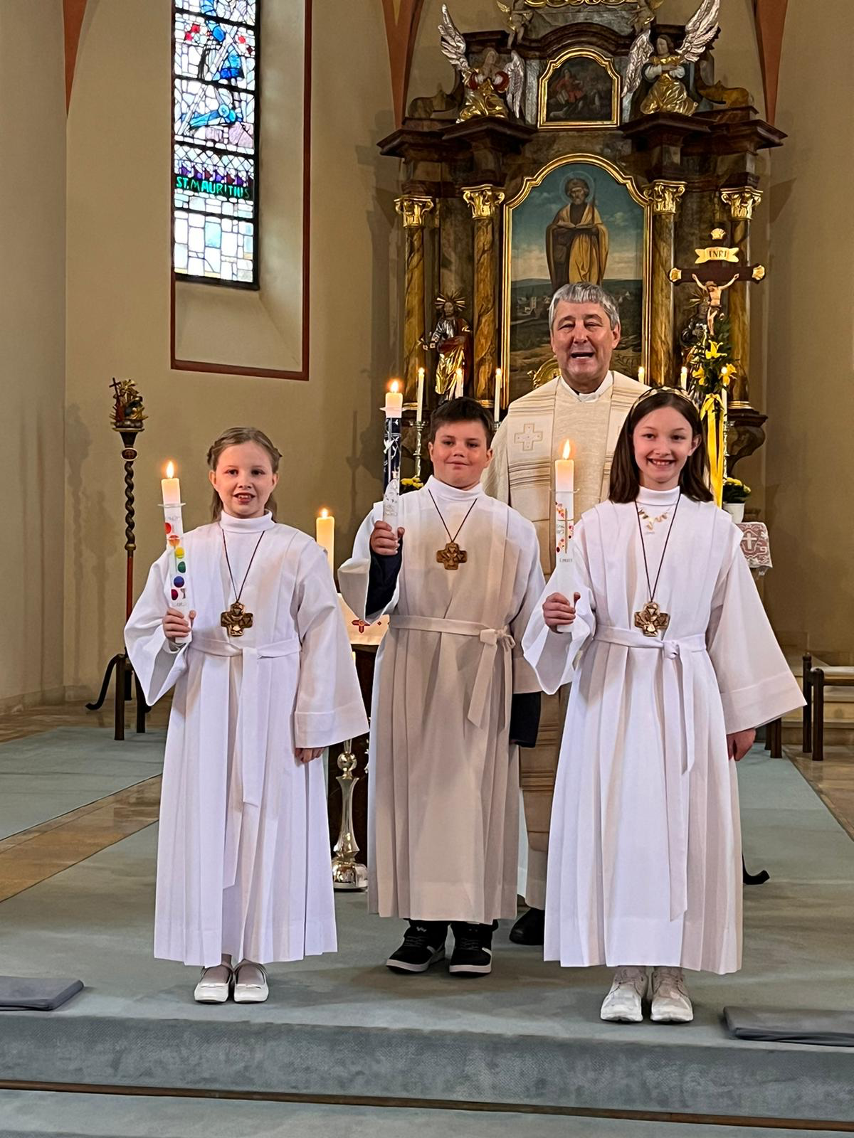 Laura Preßl, Sandro Zwack und Emily Lindner (von links) mit Pfarrer Adam Nieciecki vor dem Hochaltar des Heiligen Jakobus. Foto: Sieglinde Schärtl