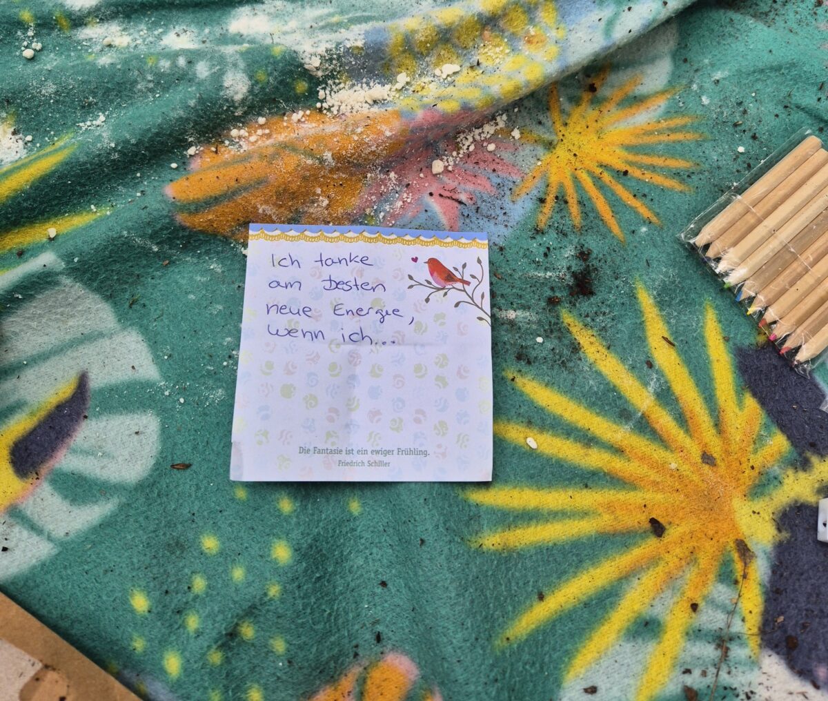 Nach dem kurzen Liedkreis freuen sich alle über die gemeinsame Brotzeit auf den Picknickdecken. Während die Kinder die mitgebrachten Leckereien essen, verteilt Katharina Winter kleine Zettel mit einer Impulsfrage an die Mütter: „Wie schaffe ich es, im Alltag kurz Kraft zu tanken? Was schenkt mir Energie?“ Diese Fragen regen die Mamas zu persönlichem Austausch an und öffnen wertvolle Gespräche über Selbstfürsorge – ein zentrales Thema für Eltern kleiner Kinder. „Die Eltern-Kind-Gruppen nach dem Regensburger Konzept sind ja ein Teil der Erwachsenenbildung“, erklärt Leiterin Katharina Winter. „Für mich persönlich ist genau das besonders spannend: Meine Stunden so zu gestalten, dass sowohl die Kinder als auch die Eltern davon profitieren.“