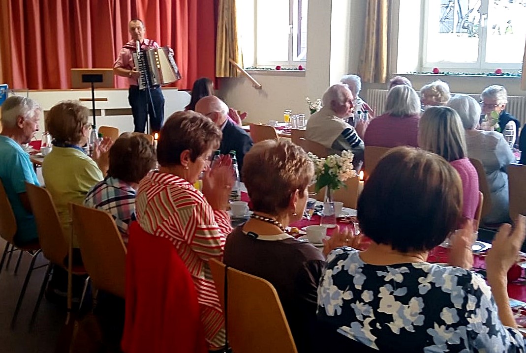 Pfarrer Andreas Hanauer leitete das gemeinsame Gebet und bat unter anderem um Beistand für den neuen Papst Leo XIV. Der geistliche Teil der Veranstaltung startete mit einer musikalischen Darbietung. Musiklehrer Wolfgang Ziegler begleitete den Nachmittag mit Akkordeonmusik und sorgte für eine heitere Atmosphäre.