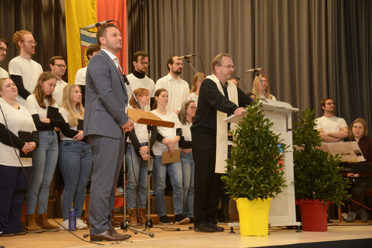 Pfarrer Thomas Stohldreier brach in seiner Ansprache eine Lanze für die neue Mehrzweckhalle, die allein schon beim Betreten ein heimisches Gefühl vermittle, was ein Zeichen für eine gelungene Grundsanierung sei. Die Planungszeit und die Umsetzung des Vorhabens zeigten, mit welcher Liebe und Hingabe an dieses Projekt herangegangen worden sei. In die Einweihung der Mehrzweckhalle sei der Dank an alle eingeschlossen, die mit ihrer Arbeit und ihrem Einsatz für ein „so wunderschönes“ Gebäude gesorgt hätten, das wieder zum Zentrum der Gemeinde werde. „Dieses Ortszentrum hat uns die letzten drei Jahre etwas gefehlt.“ Dann sprach der Geistliche vorausgegangene Worte des Bürgermeisters an, der sinngemäß gesagt habe, dass der „Geist der Freude und der Gemeinschaft“ von diesem Gebäude für die gesamte Gemeinde ausgehe. Anschließend sprach Pfarrer Thomas Stohldreier die Segensworte: „Segne unsere Mehrzweckhalle, segne alle, die sie nutzen, mit gegenseitiger Achtung und Hilfsbereitschaft, bewahre uns vor Schaden und Gefahr, schenke uns Gesundheit und Freude, darum bitten wir durch Christus unseren Herrn.“