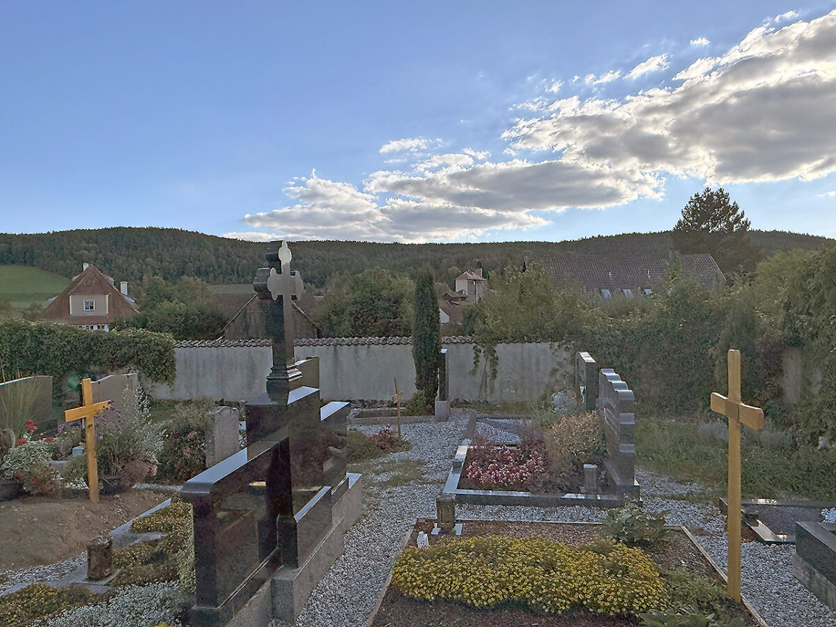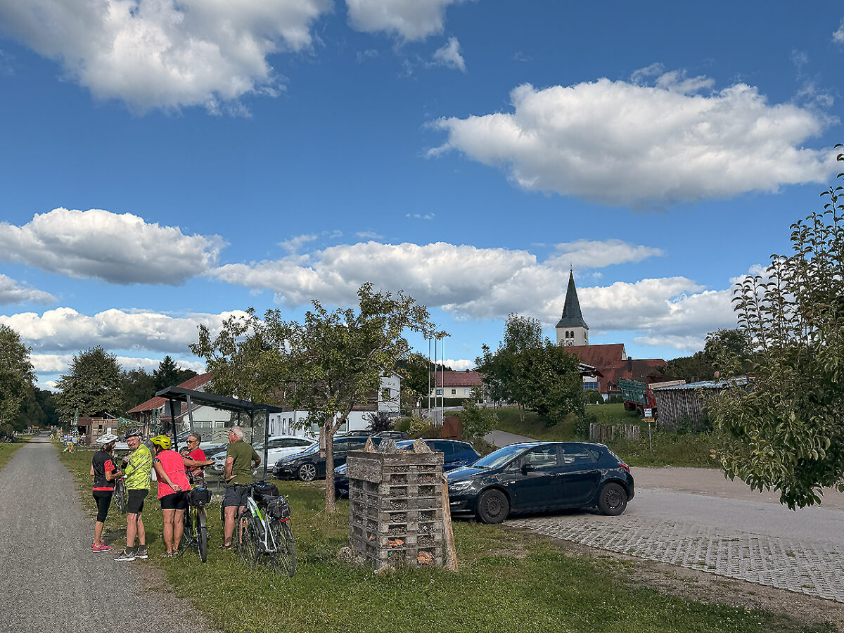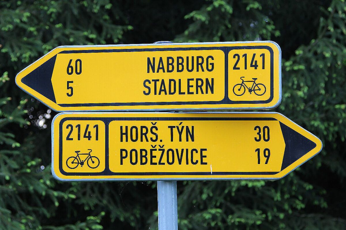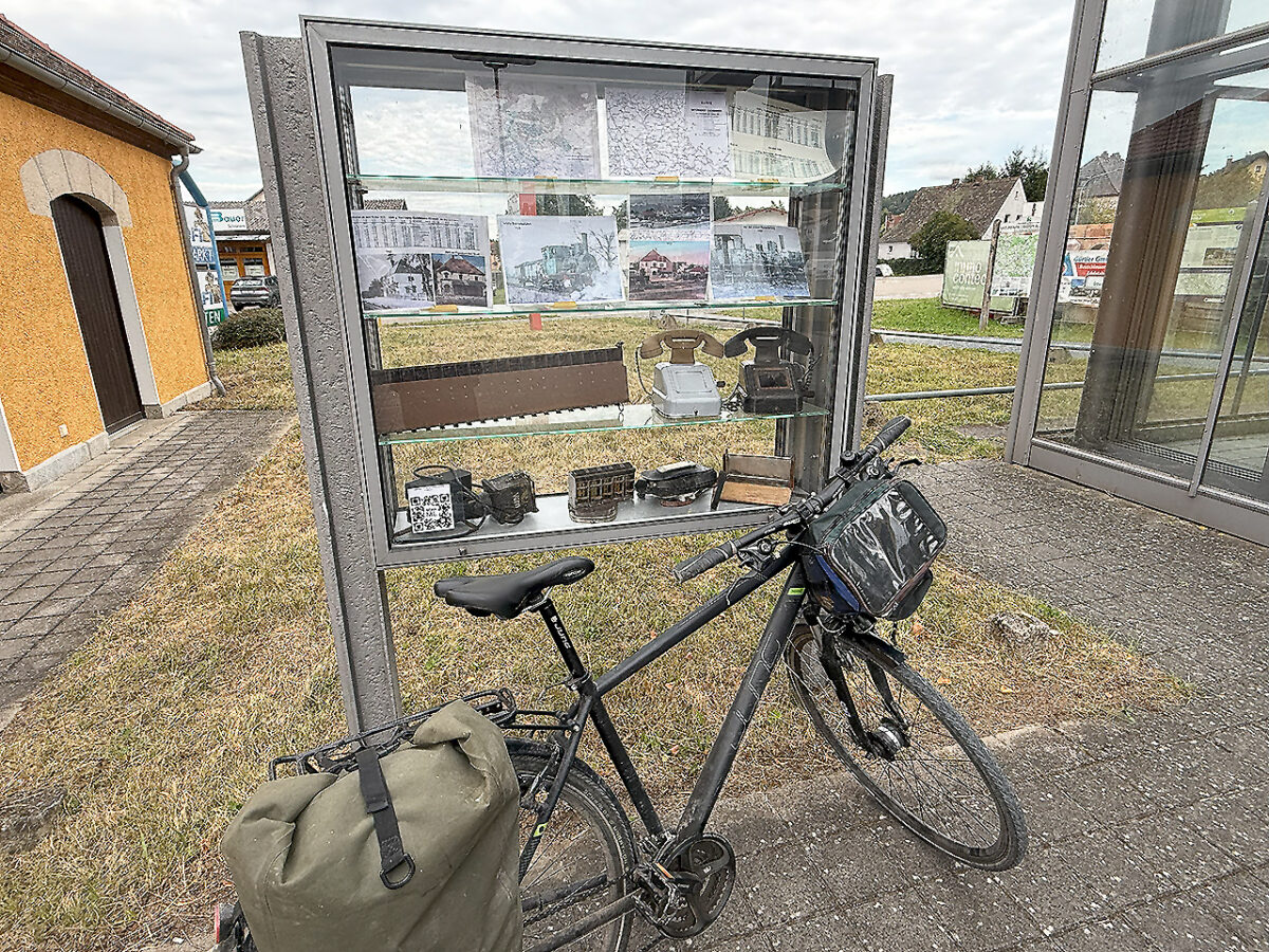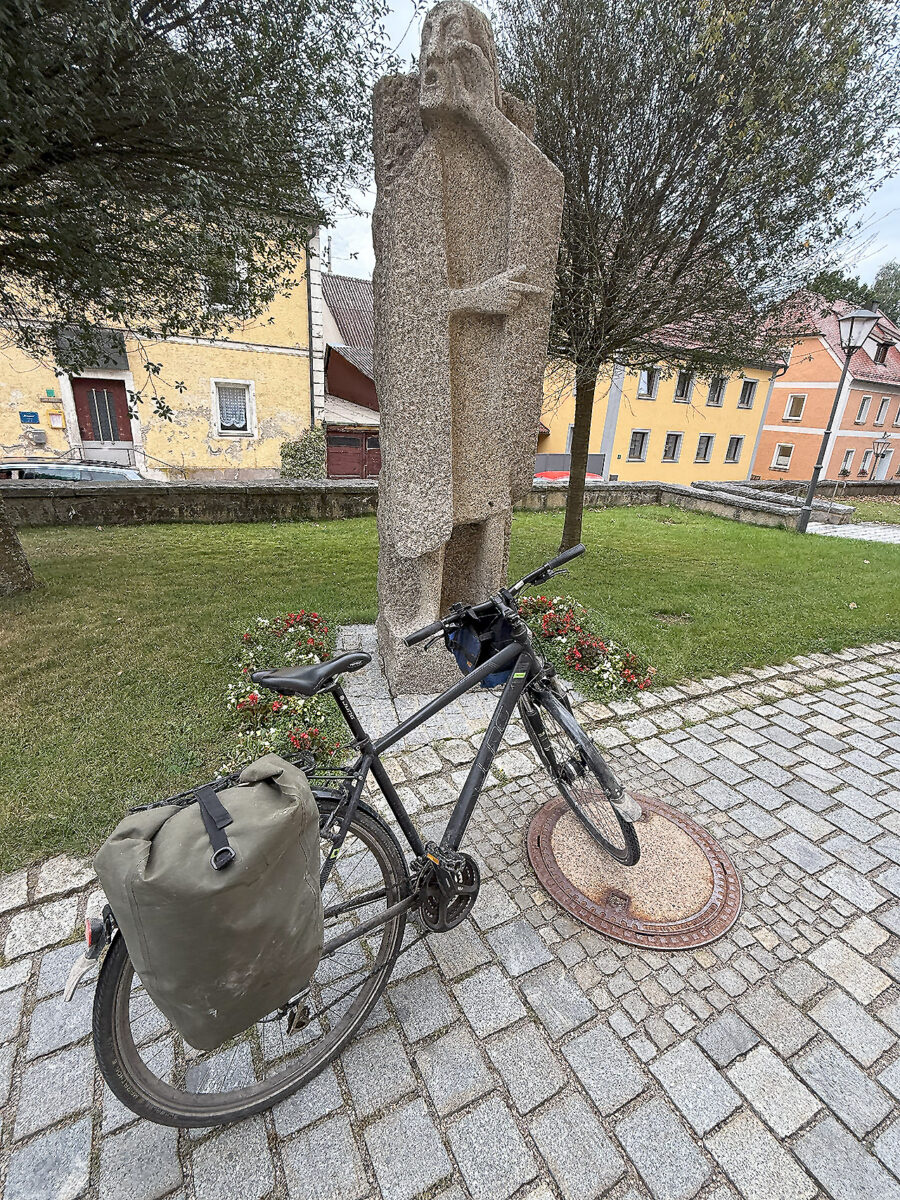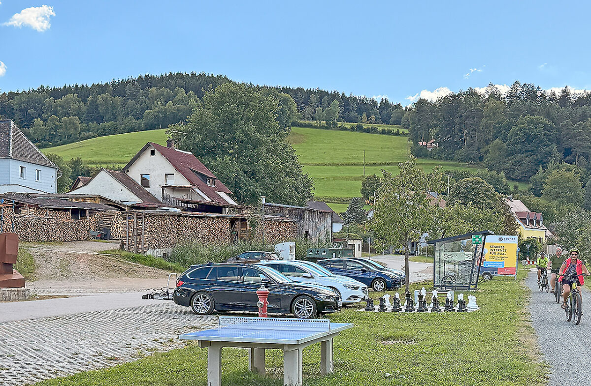 Wir halten kurz, lehnen die Räder an die Mauer und lauschen: Glocken, Vögel, der ferne Ruf eines Hahns. Alles klingt wie ein Gebet in Moll. Am Ortsrand ein kleiner Friedhof, in dem Deutsch und Tschechisch nebeneinander auf den Steinen wohnen. Die eine Hälfte verweht, die andere neu gesetzt. Geschichte, die nicht schreit, sondern flüstert.