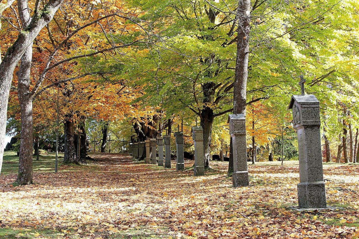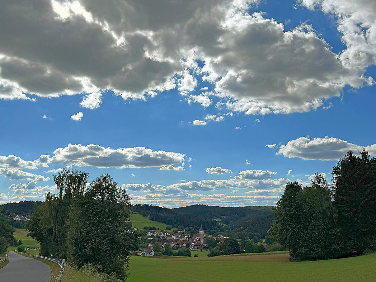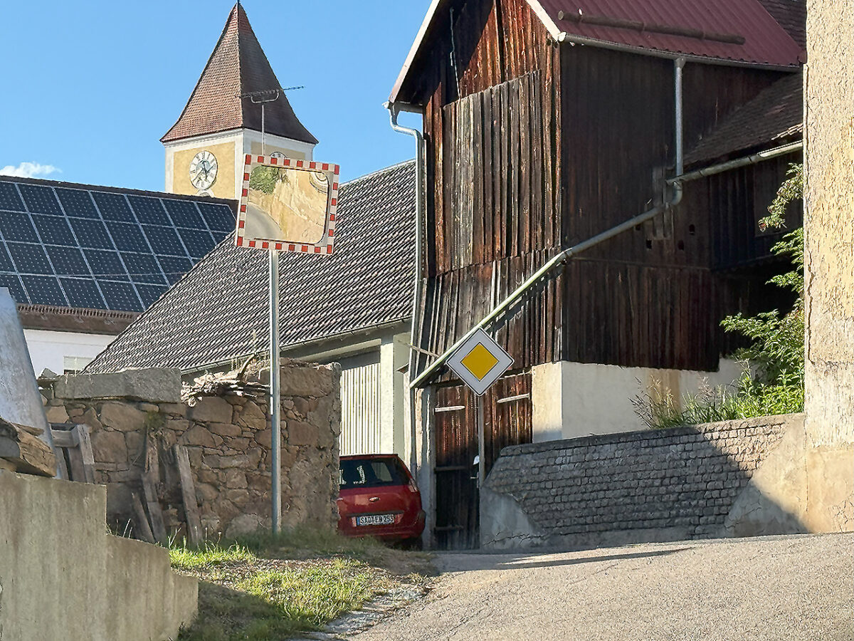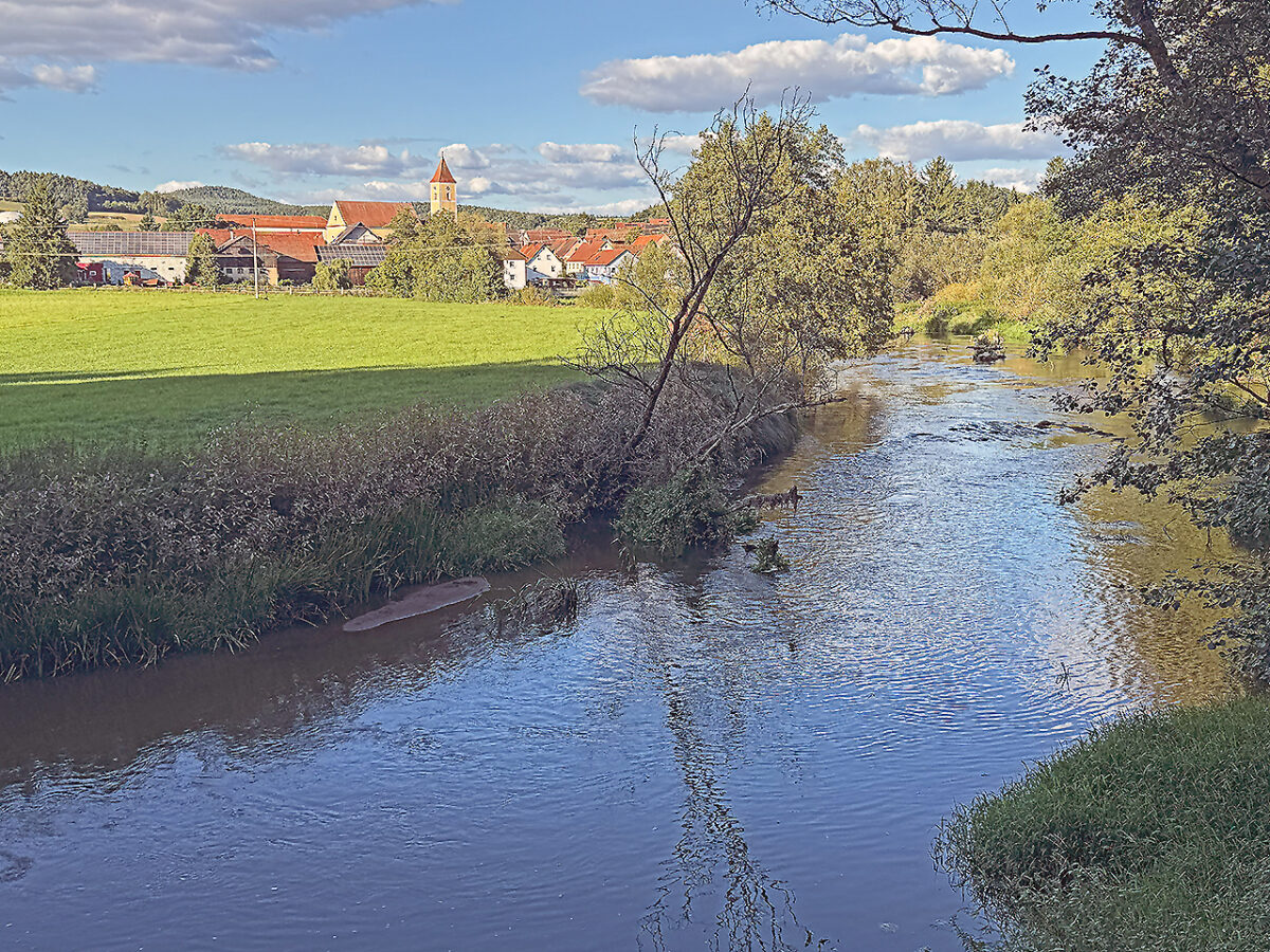Die Schwarzach begleitet uns mäandernd wie eine störrische Freundin: mal links, mal rechts, mal spurlos verschwunden. In Altendorf erhebt sich die Kirche St. Andreas auf einer kleinen Anhöhe, flankiert von ihrem barocken Langhaus – eine stille Majestät aus dem 14. Jahrhundert. Daneben das Alte Schloss, dreigeschossig, mit Treppenturm und Sprenggiebel – Zeuge einer Zeit, als hier noch Freiherren und Freisinnige Hof hielten. Der Weg hinauf zum Kalvarienberg lohnt die Schweißperlen: Vierzehn Granitpfeiler mit Gipsreliefs, Kreuzwegstationen aus dem 19. Jahrhundert, die vom Fleiß der Dorfbildhauer erzählen. Oben steht die Kreuzigungsgruppe im Wind, flankiert von zwei kleineren Kreuzen, rostig und erhaben.