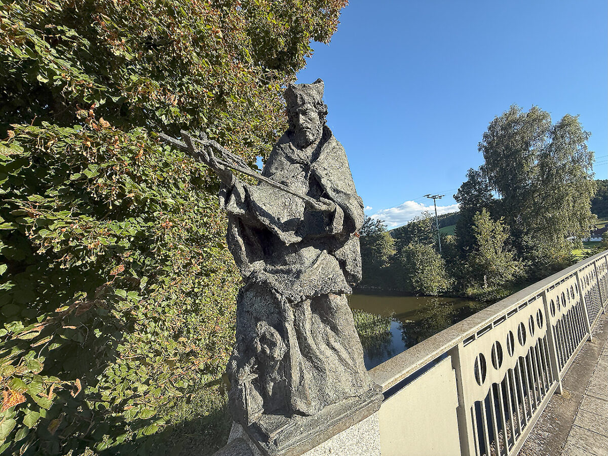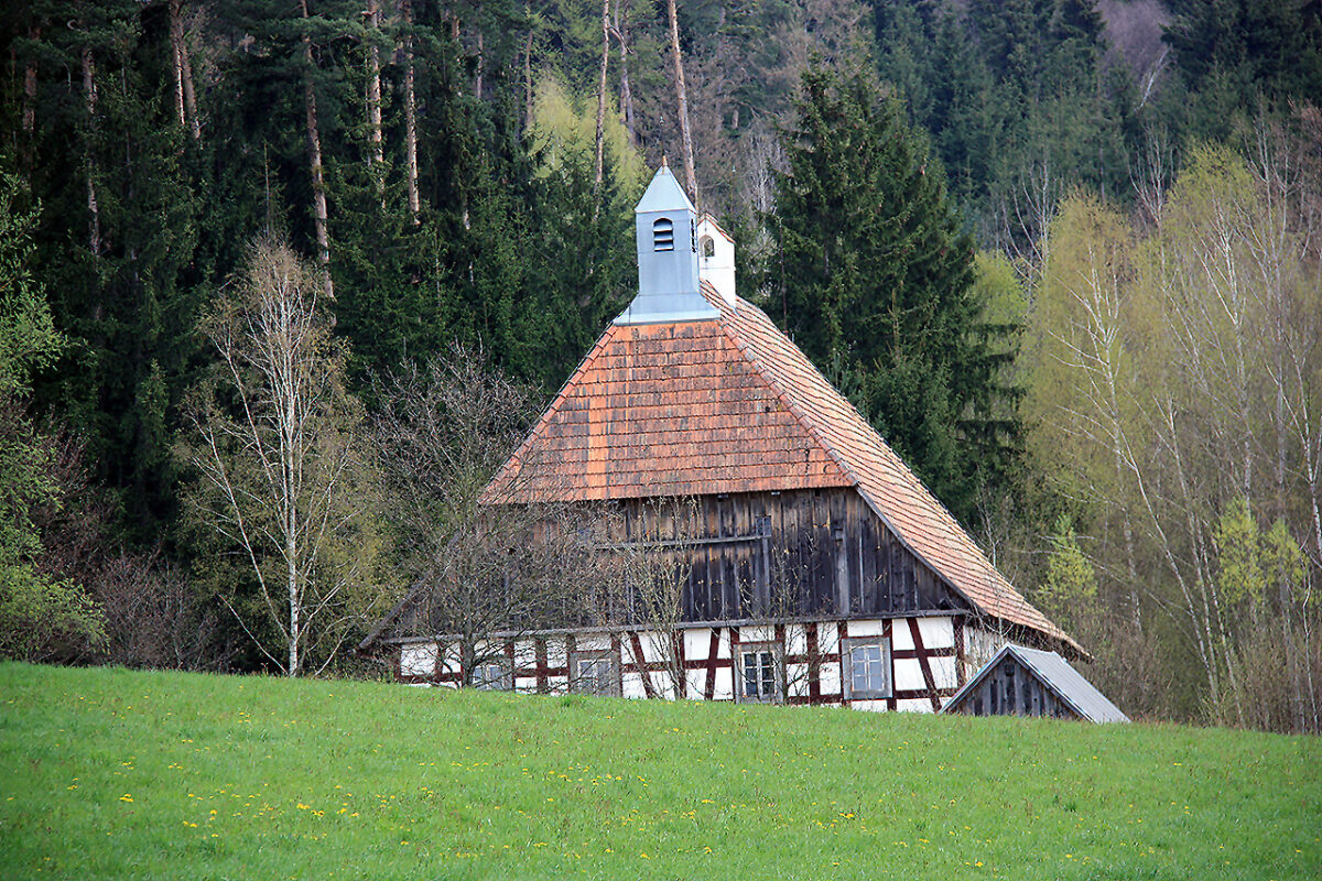 Hinter Oberviechtach wird die Landschaft einsilbiger. Schneeberg liegt wie ein Halbsatz im Tal, eine Handvoll Häuser, ein Bach, eine Kirche. Früher Eisenhammer, später Ödnis. Heute still. In der romanischen St.-Wolfgangs-Kirche stehen zwei Holzfiguren aus dem 18. Jahrhundert – Johannes und Petrus, halb abgenutzt, halb wachsam. Draußen rauscht die Ascha, drinnen klingt das Holz wie Orgel.