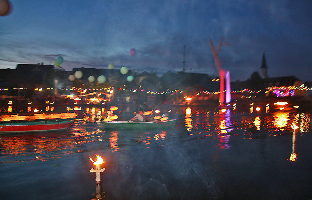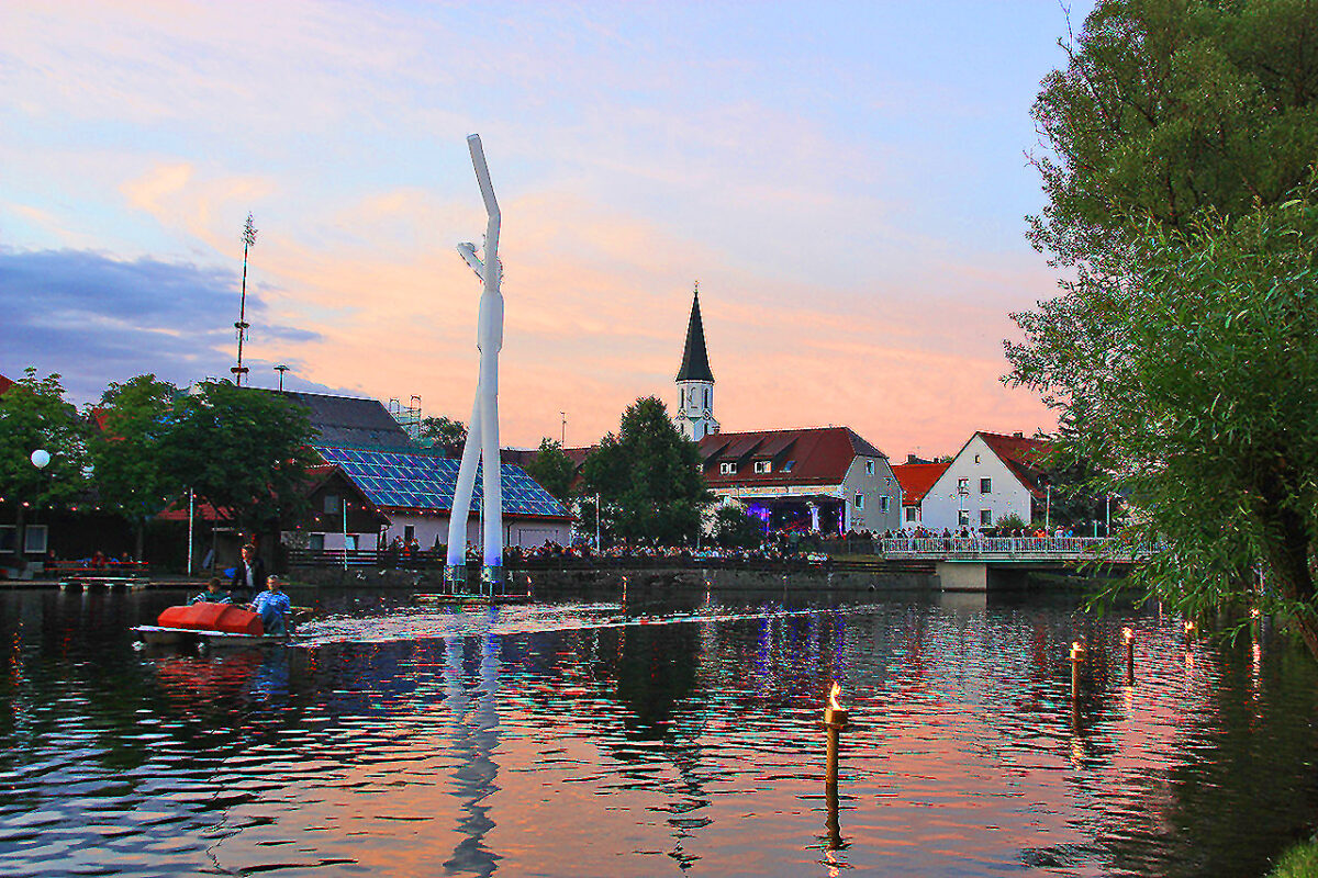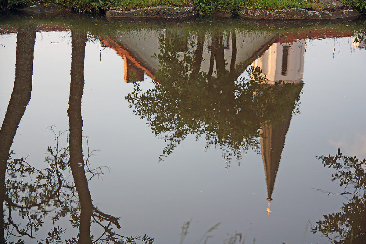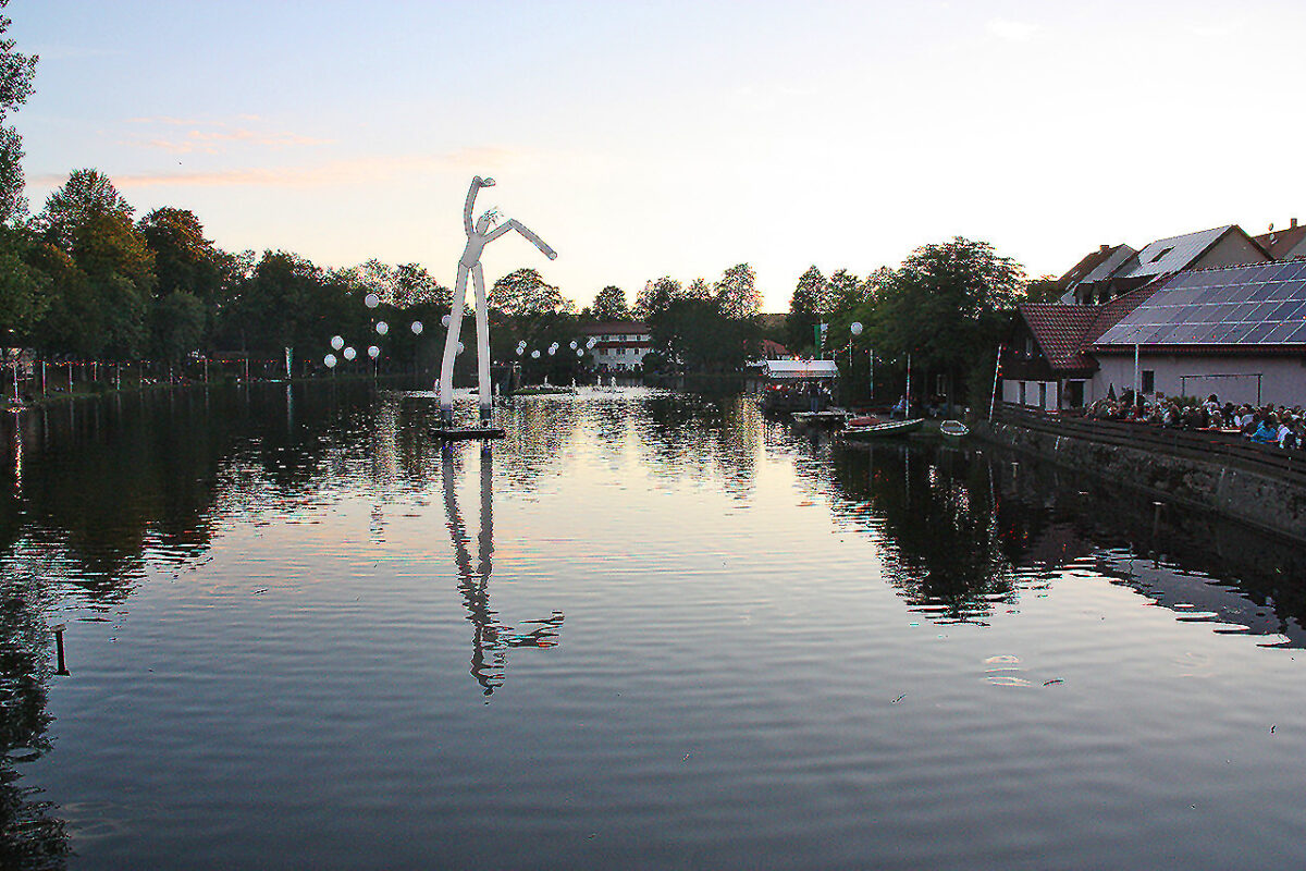 Hinter Zangenstein ändert sich der Ton. Der Asphalt wird rau, das Licht silbrig. In Uckersdorf, wo nach langer Geduldsprobe die Brücke samt Radweg daneben demnächst fertiggestellt werden dürfte, leuchtet gleich hinter dem ehemaligen Baumarkt in einer Gründerzeit-Villa ein steinernes Labyrinth aus dem Gras: die Trojaburg. Kein Vergnügungspark, kein Kitsch – sondern ein steinernes Sinnbild. 18 Meter Durchmesser, 250 Meter Weg. Wer’s betritt, verliert die Richtung, gewinnt Geduld. Gerhard Würl hat’s gebaut – als Ort des Nachdenkens und der Sommersonnenwendlichter. Jedes Jahr im Juni flackern hier Teelichter wie kleine Seelen, die den Weg suchen.