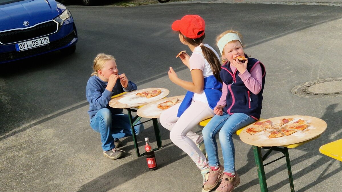 Pizzabäcker Thomas Bartmann hatte alle Hände voll zu tun und schob pausenlos die belegten Scheiben in den Backofen. Der große Andrang verursachte schon Wartezeiten, bis sie knusprig gebacken wieder heraus geholt wurden. Um so besser ließen sich die Kinder dann ihre Kreation mit einem passenden Getränk schmecken. Siebzig Pizzas waren es zuletzt, die gebacken wurden und kein Krümel ist davon übrig geblieben.