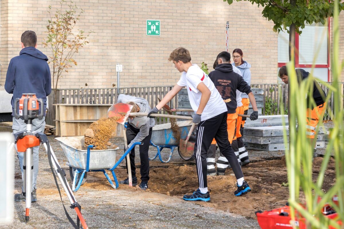 Die vier Rundbänke wurden rund um einen bestehenden Baum im oberen Pausenhof errichtet. Wo möglich, durften die Neuntklässler natürlich selbst Hand anlegen und sich versuchen. Vor dem Griff zu Schaufel und Co. stand zunächst genaues Messen auf dem Plan – das Gefälle des angelegten Geländes mussten die Schüler dabei ebenso berücksichtigen wie die passenden Abstände und Ausrichtung der Sitzbänke. Im nächsten Schritt wurden die Betonplatten im vorgesehenen Baufenster entfernt und zur späteren Wiederverwendung aufgeschlichtet. Mit Schaufel und Spaten bewaffnet, trugen Schüler und Auszubildende den Untergrund rund 20 Zentimeter ab, ehe der Boden als Standfläche für die Betonbänke nochmals verdichtet wurde.
