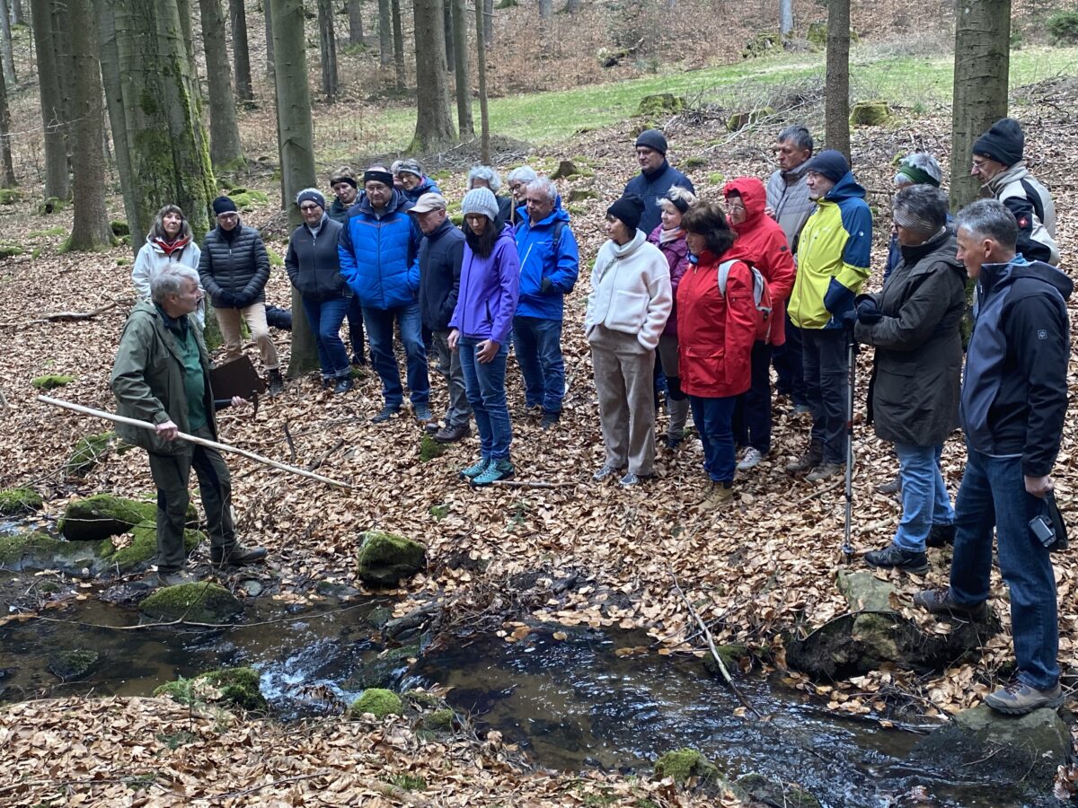 Zum Aktionstag am 22.03. organisierte Diplombiologe Lothar Kroll ein gewässerkindliche Führung, die zum Mühlbach -charakterisiert als grobmaterialreicher, silikater Mittelgebirgsbach- in Tännesberg führte. Über „Stock und Stein“ ging es für die 25köpfige Gruppe entlang des Gewässers, wo Kroll eindrucksvoll die Schwachstellen und vor allem die natürlich erhaltenen Abschnitte mit seinem Strukturreichtum im und am Wasser eindrucksvoll erklärte. Der Mühlbach mit einem Einzugsgebiet von 6 Quadratkilometern entspringt zwischen Vogelherd und Bürschling und mündet nach ca. 4,5 km bei Lampenricht in die Gleiritsch. Als sommerkalter Bach der Forellenregion bietet er Lebensraum u.a. für Bachforelle, Koppe und Schmerle. Neben den stofflichen Belastungen durch die Teichwirtschaft, die zwar im weiteren Verlauf ziemlich abgebaut werden, bilden Verrohungen und Durchlässe für die Tiere unüberwindliche Hindernisse. Auch Begradigungen des Bachbettes oder sogar die Verlegung aus der Talmitte zerstören vielfach die Lebensgrundlage der Wasserbewohner.