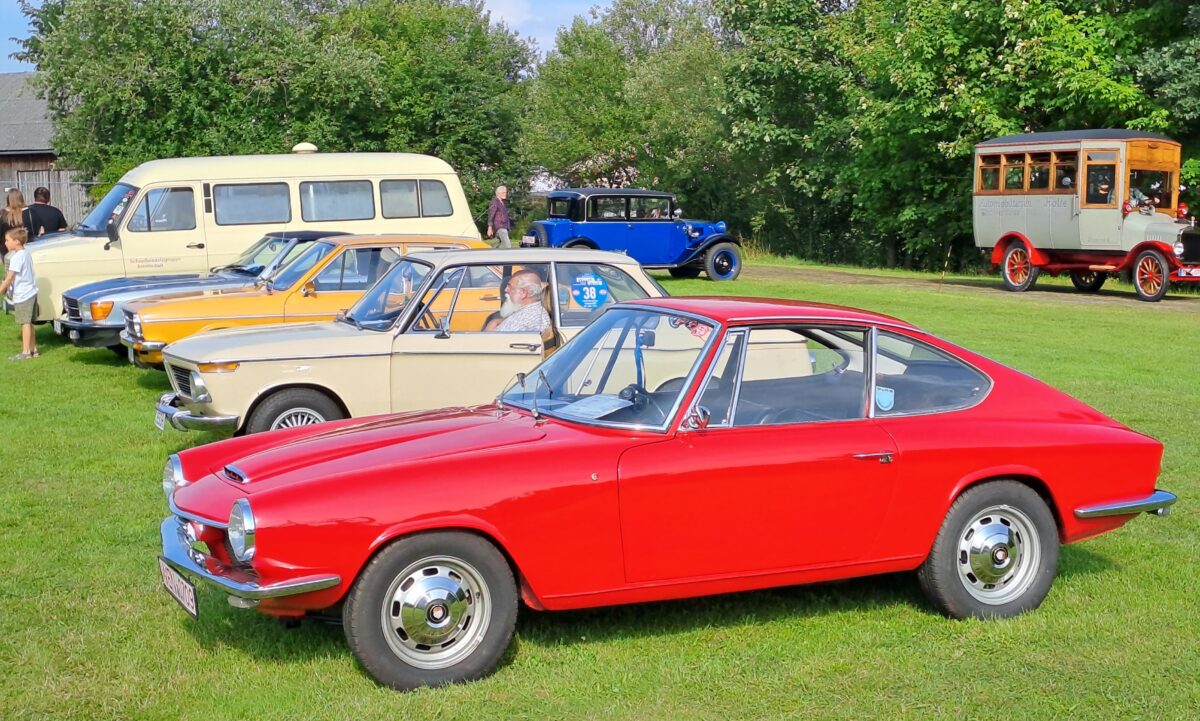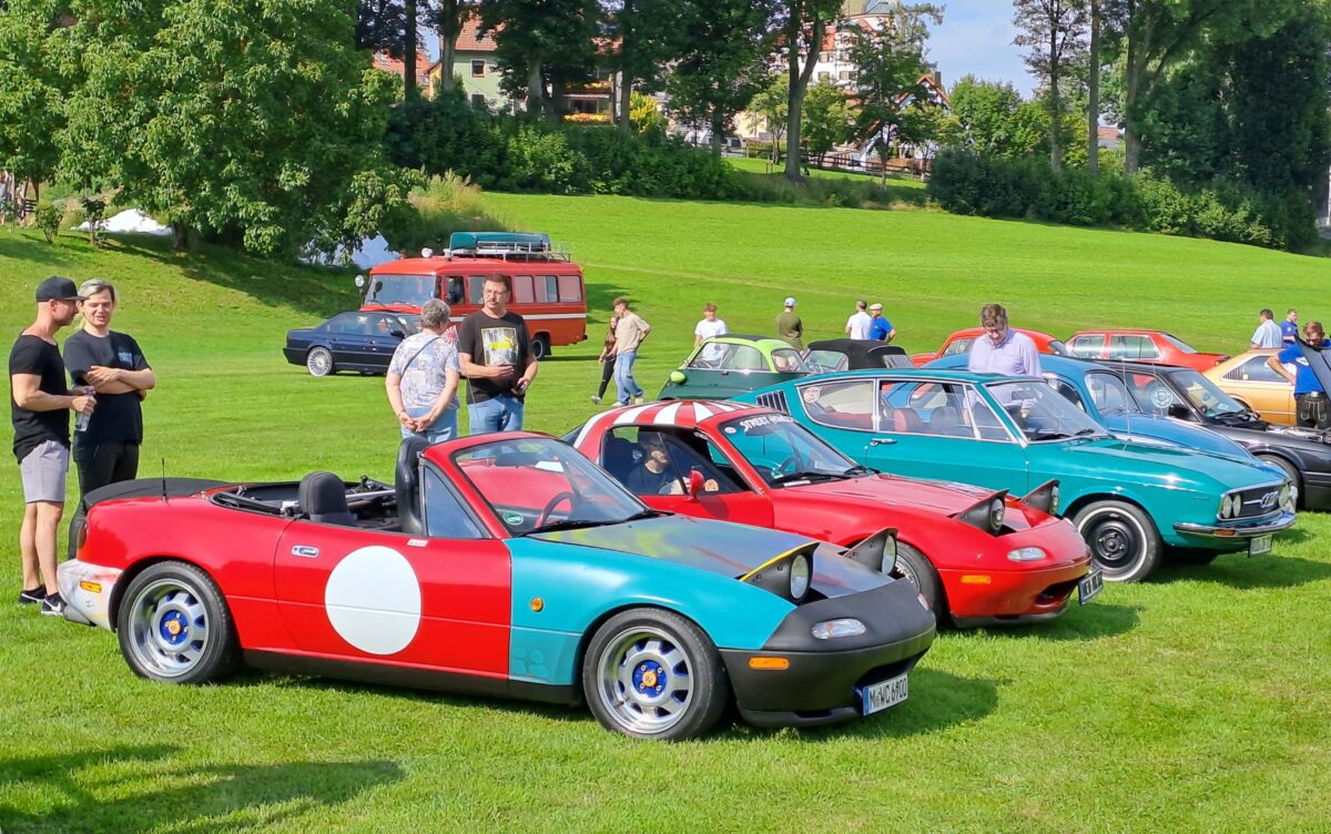 Zahlreiche offene und geschlossene Serien-Autos aus den letzten sechs Jahrzehnten, die teilweise liebevoll verfeinert oder gar getunt waren, rundeten das bunte Bild auf der grünen Wiese ab. Ihre Herkunftsländer reichten von Ost- und Westdeutschland über England, Frankreich und die Tschechische Republik bis Japan und die USA. Eine bildhübsche BMW Isetta war ebenso darunter wie ein Audi 100 Coupé. Sportliche BMW- und Glas-Typen ergänzten auffällig lackierte Mazda MX-5 Roadster, verschiedenste Mercedes-Modelle sowie nicht zuletzt VW Käfer. An einem Käfer-Cabrio aus Mittelfranken hing sogar ein QEK Junior – ein bis 1990 in der DDR gebauter Wohnanhänger mit selbsttragendem Polyester-Aufbau und Hubdach.