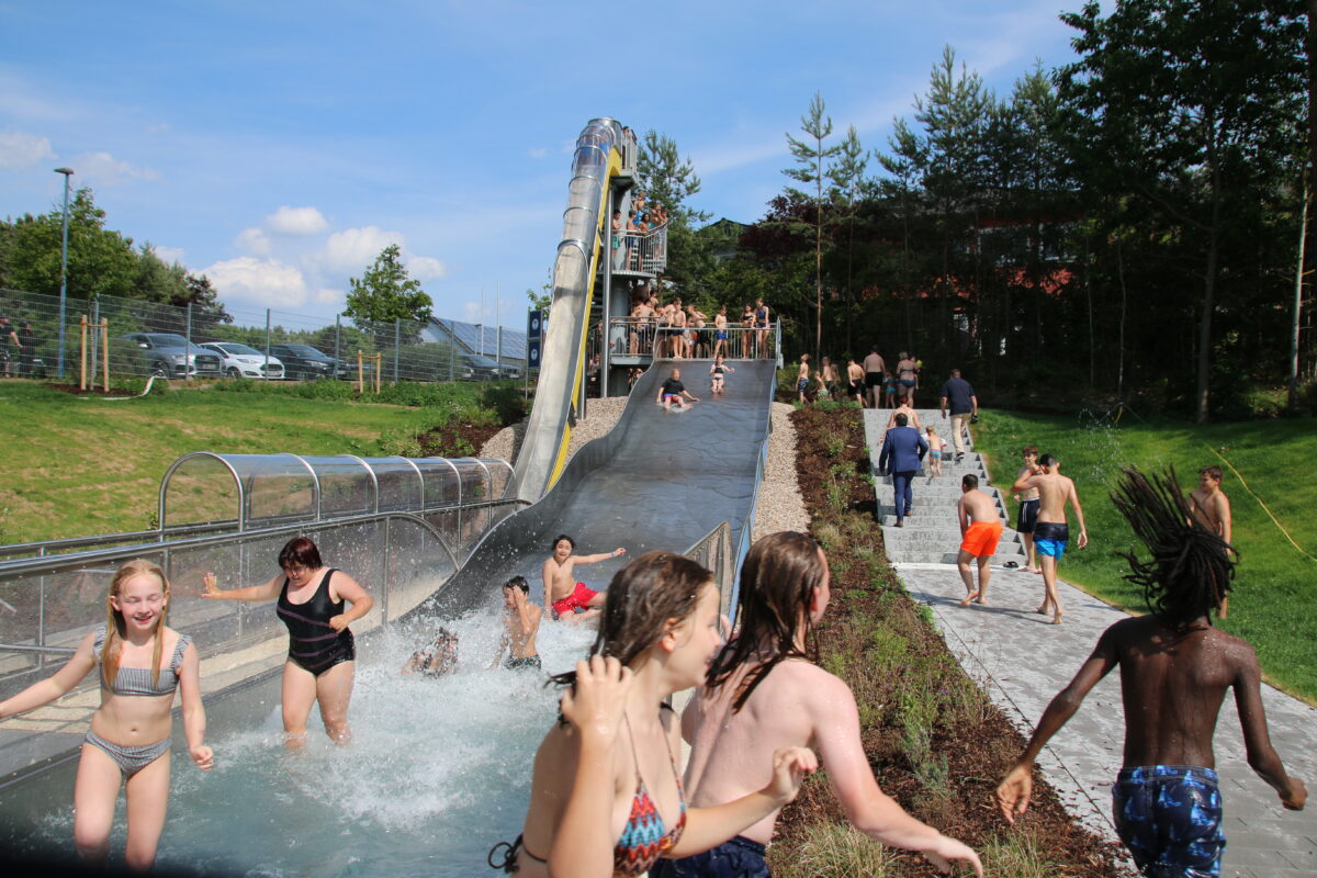 Glückliche Kindergesichter freuen sich über neue Wasserrutsche