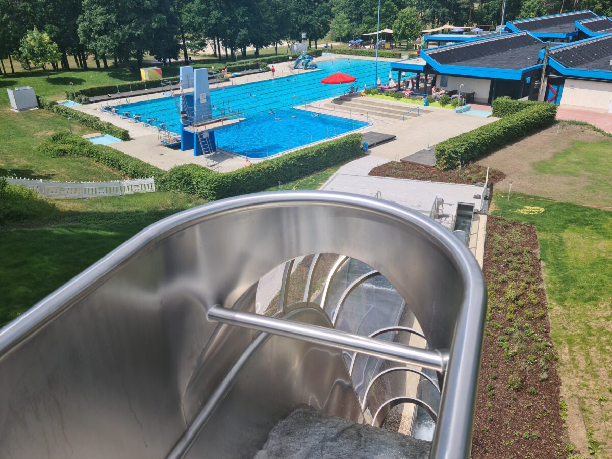 Oben auf der zehn Meter hohen Freefallrutsche angekommen hat man zuerst einmal einen wunderbaren Ausblick über das Waldbad. Die Benutzung ist nur für eine Person auf einmal erlaubt, darum versperrt ein elektronisches Drehkreuz die Bahn, bevor sie unten frei ist. Dann steht man vor dem steilen 60-Grad-Rutsch – wer hier lange nachdenkt, der kann schon Zweifel bekommen. Also einfach rein in den Abgrund. Ein kurzer Adrenalinschub angesichts des Falls und schon wird man im flachen Becken gebremst. Die Benutzung ist ab acht Jahren freigegeben.