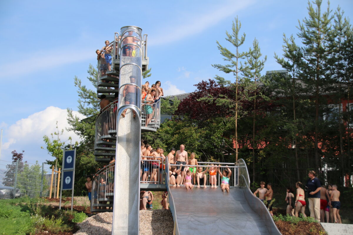 Die Rutsche ist ein echter Publikumsmagnet. So viele Kinder waren das ganze Jahr noch nicht im Bad, kaum waren sie unten angelangt, sprangen sie die Treppe schon wieder hinauf für die nächste Runde.