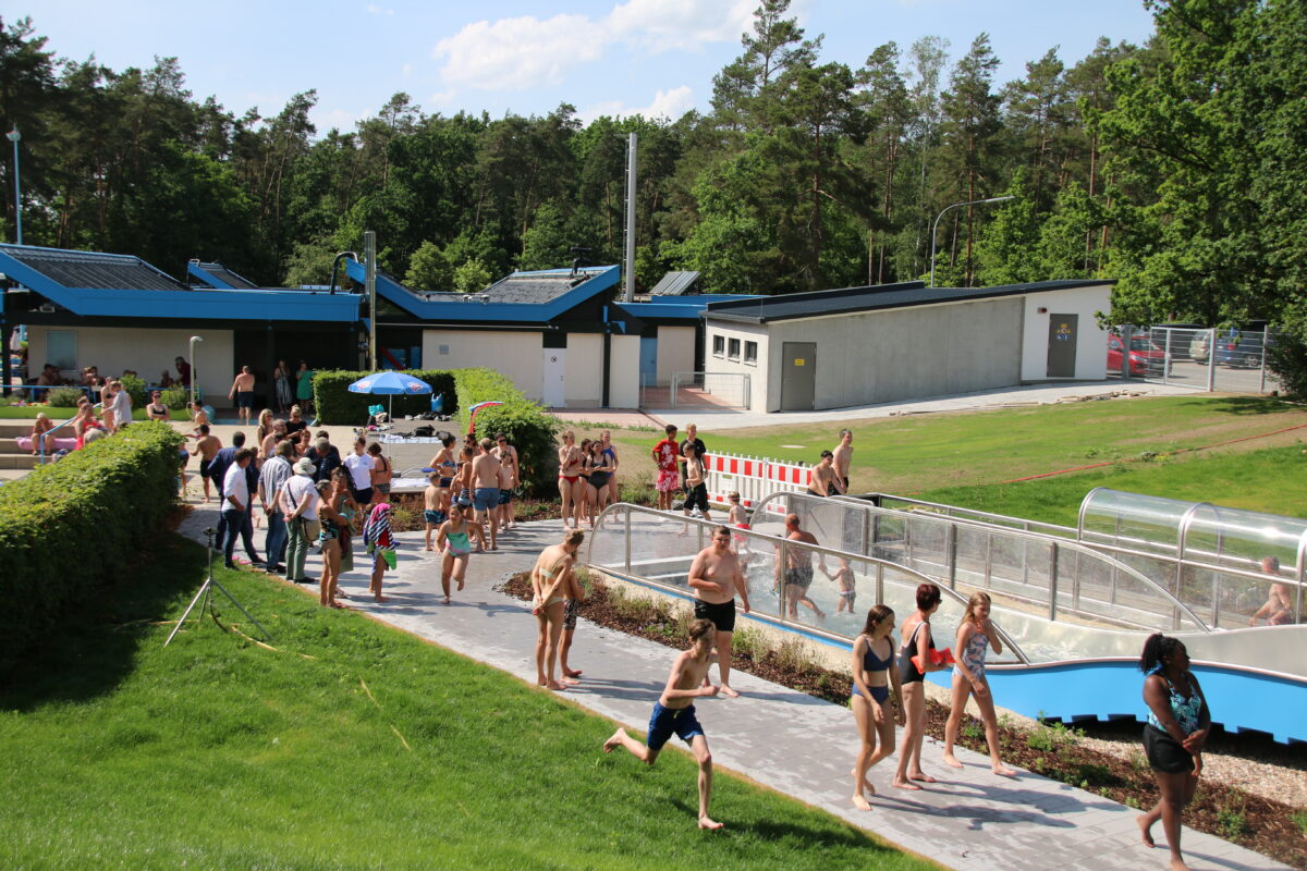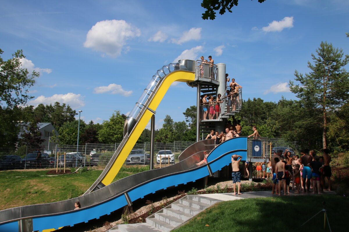 Ungeduldig haben Groß und Klein darauf gewartet, nun war es so weit: Die neue Wasserrutsche ist offiziell eröffnet. Angesichts der Sehnsucht in den vielen Kinderaugen wollte Bürgermeister Edgar Knobloch dann nicht mal bis zur offiziellen Eröffnung um 16 Uhr warten, sondern gab die Rutsche ein paar Minuten früher frei. Und der Sturm auf die Treppen ging sofort los.