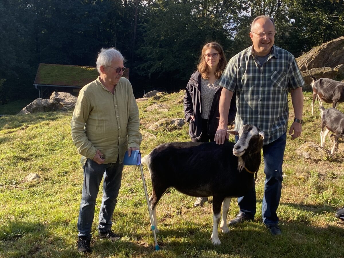 Bereits seit dem Frühjahr springen nun wieder Thüringer Waldziegen, eine bedrohte Haustierrasse, in einer kleinen Herde über die Weideflächen. Über vier kleine Zicklein, die bereits im ersten Weidejahr lebendige Vielfalt auf die Weideflächen brachten, freuten sich Irmi Schwarz, Toni Wolf und Korbinian Schönberger von der Bund-Naturschutz-Ortsgruppe.