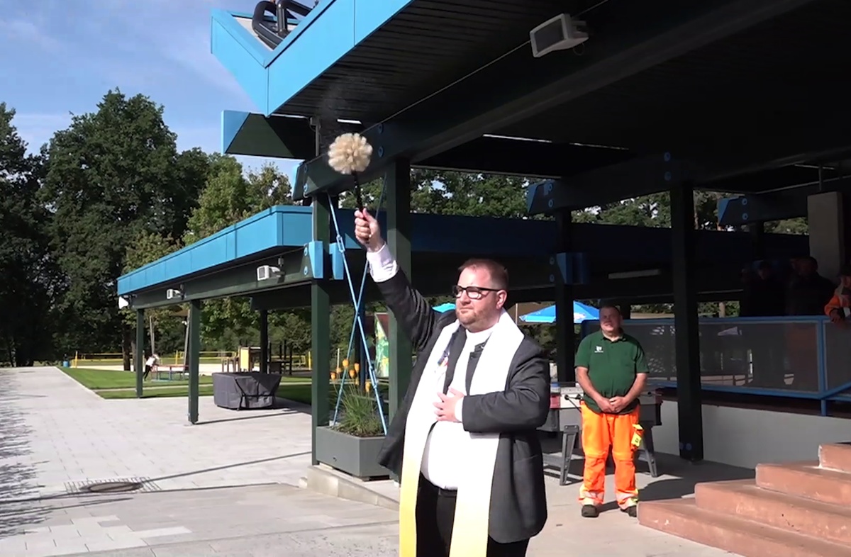 Für einen würdigen Abschluss der Feier sorgte Stadtpfarrer Daniel Fenk, der das neue Waldbad mit Weihwasser segnete – ganz ohne Sprung vom 5-Meter-Turm. In seiner humorvollen Ansprache wünschte er allen Besucherinnen und Besuchern eine unfallfreie und erholsame Badesaison.