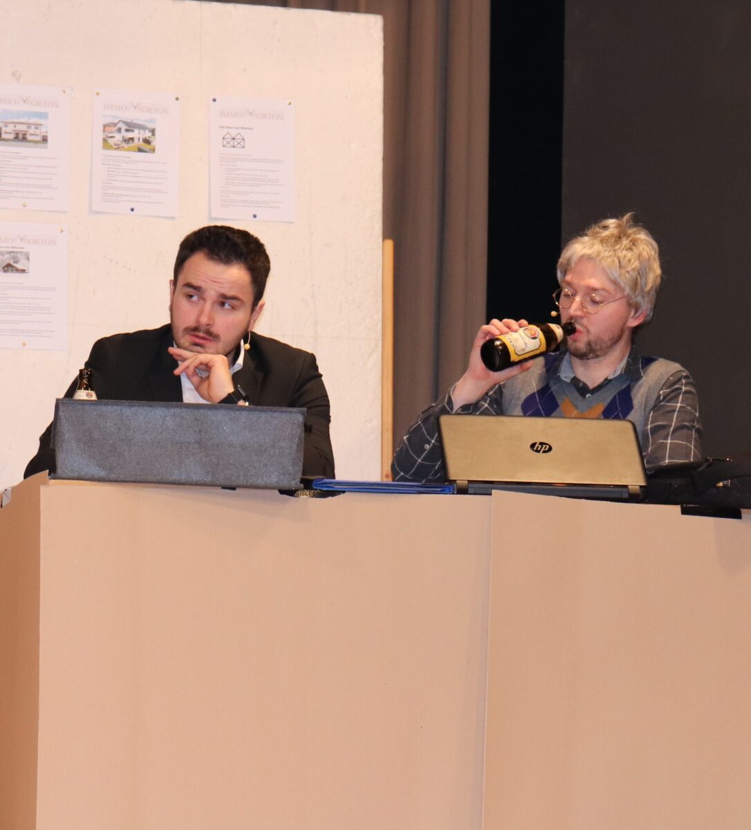 Mit Charme wurden der inzwischen 90-jährige Ruhestandspfarrer Hans Bayer und Pfarrer Daniel Fenk mit Yin und Yang, leise und laut, Alt und Jung, verglichen. Neben dem Neujahrsempfang mit Dr. Florian Hermann thematisierten die Darsteller den alten und neuen US-Präsident Donald Trump. Anmerkungen dazu, wie „Geht schon los wie in seiner letzten Amtszeit: viel Gerede, wenig Handlung“, „Wortschatz mangelhaft, Bildung ungenügend, das einzige Fach, in dem er nicht durchfallen würde, wäre die Märchenstunde“, wurde vom Publikum mit Applaus bedacht.