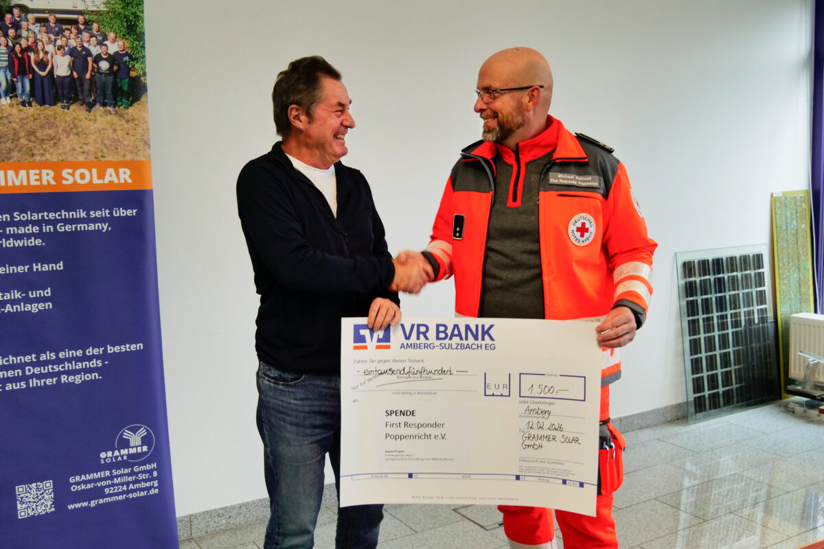 Große Freude herrschte bei den Verantwortlichen der First Responder Poppenricht über die Spendenübergabe in Höhe von 1.500 Euro durch GRAMMER Solar aus Amberg. Mit dieser Unterstützung leistet das regional verwurzelte Unternehmen einen wichtigen Beitrag zur Stärkung des ehrenamtlichen Rettungswesens.
