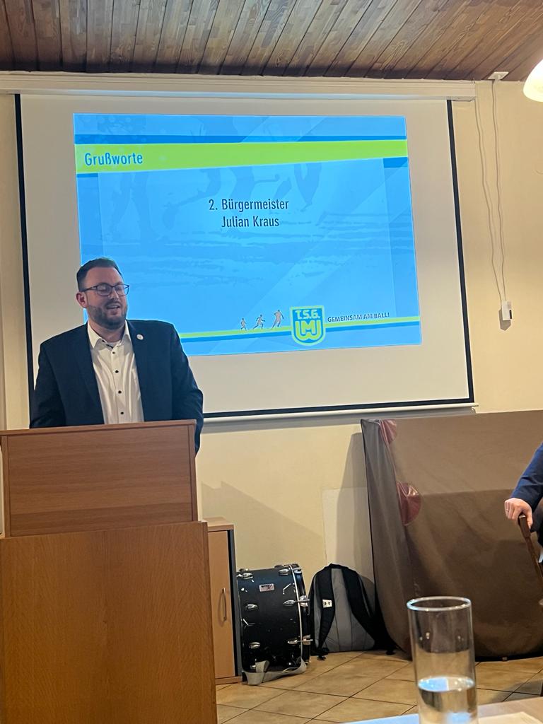 2. Bürgermeister Julian Kraus überbrachte die Grüße der Gemeinde und bedankte sich bei der TSG-Führung für die jahrelange gute Arbeit sowie den neu hinzugekommenen Ehrenamtlichen für die Bereitschaft mitzuarbeiten.