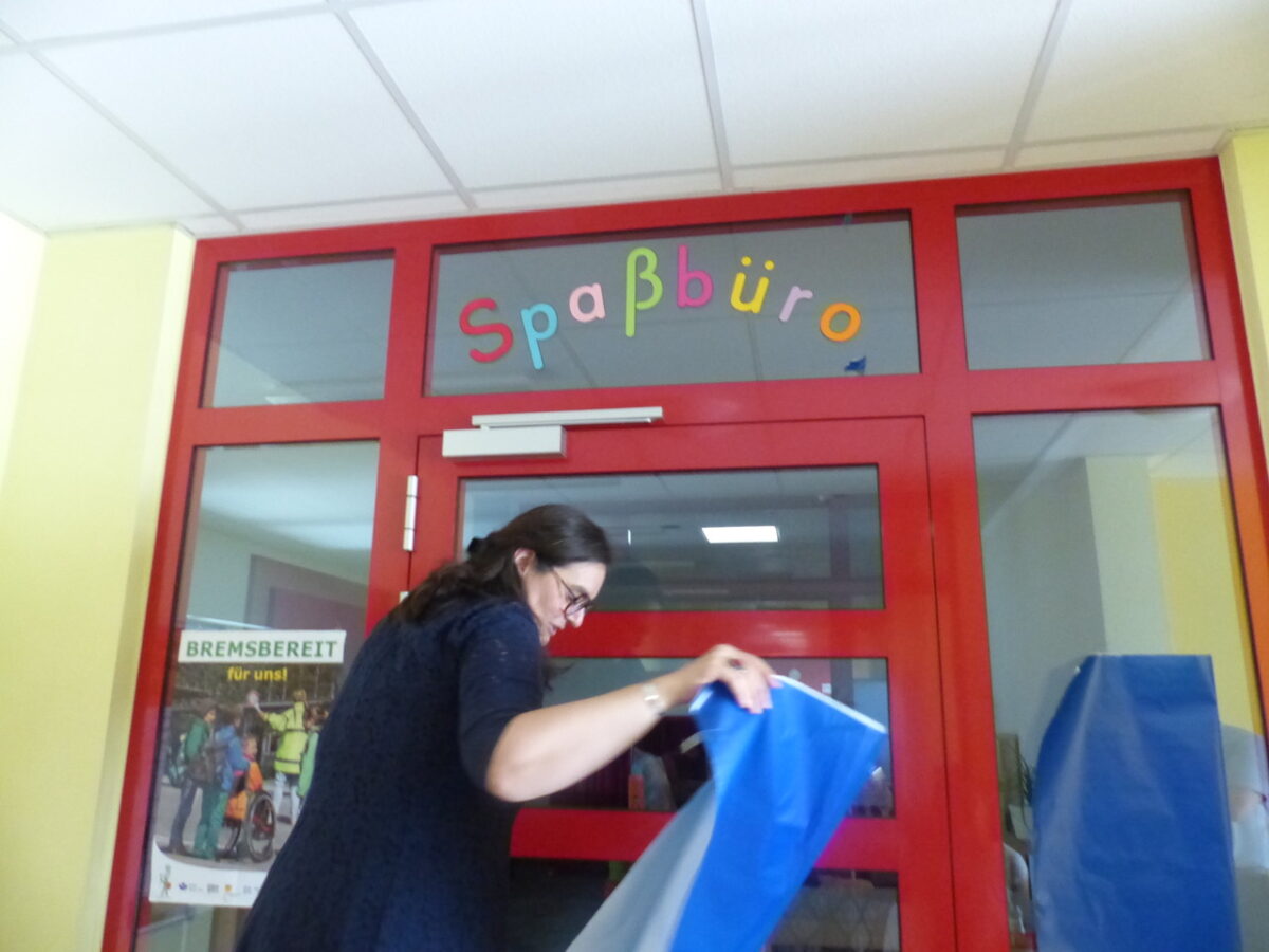 Nachdem die Kinder gestärkt waren, wurde das neue Spaßbüro innerhalb der Schule eröffnet. Dieser neu eingerichtete Raum, vormals ein Kickerraum, wurde von den Schülern selbstständig per Abstimmung benannt und im Beisein der Schulleiterin Katja Meidenbauer feierlich eröffnet.