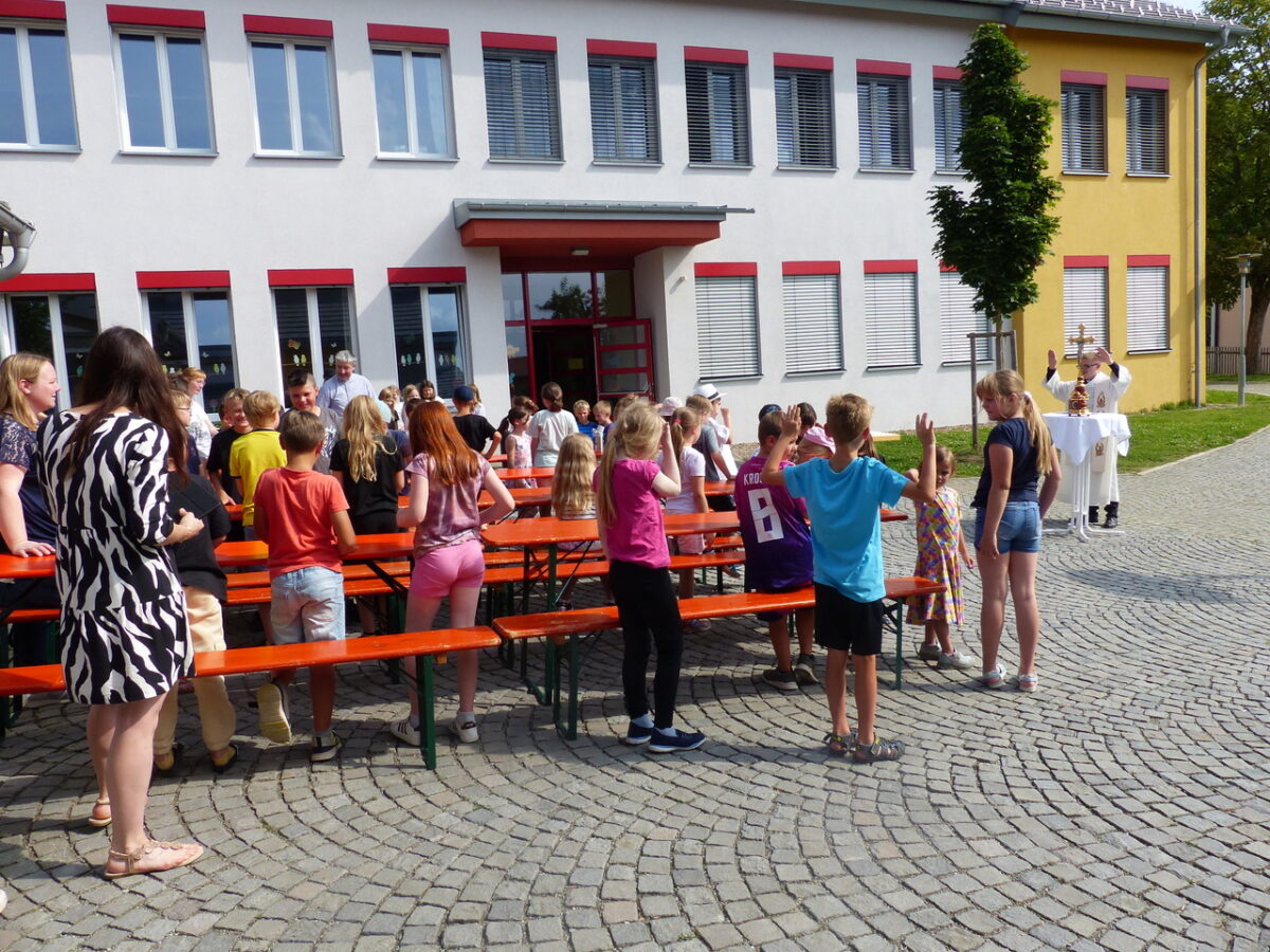 Den Höhepunkt bildete der Besuch des Neupriesters Michael Steinhilber, der auf Einladung der Lehrerin Sonja Kramer in die Schule kam. Der Priester, der erst am Wochenende seine Primizfeier erlebt hatte, wurde von Schülern, Lehrern und dem Pfarrer Adam Nieciecki herzlich empfangen. In einer Andacht im Pausenhof betonte Steinhilber die Nähe Gottes zu den Kindern und deren Schutz. Zum Abschluss erteilte er allen den Primizsegen.