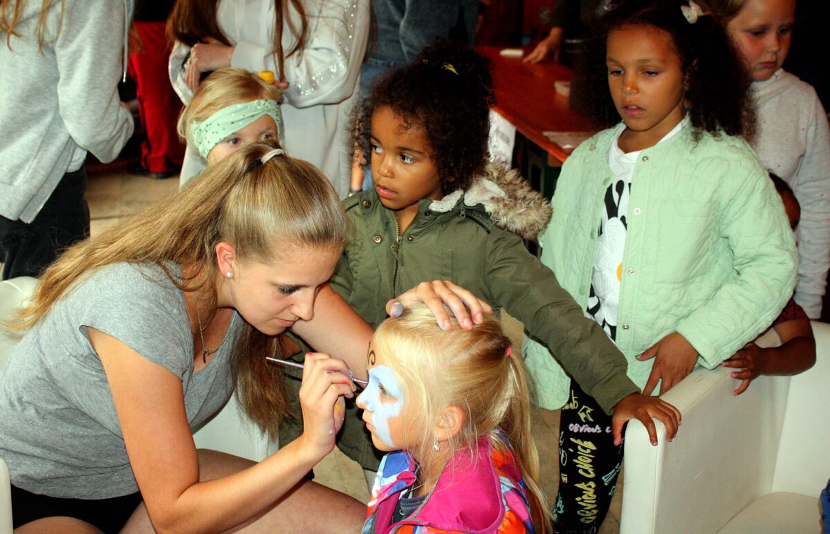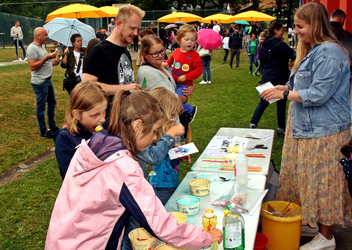 Eltern, Oma und Opa und Gäste bewunderten die Plakatausstellung „Umweltschutz Klasse 4“. Der Stand für selbstgemachte Seifenblasenkunst war stets umlagert, so entstanden kleine Kunstwerke – selbst gefertigt, gepustet und getrocknet. Einen Schmetterling im Gesicht, oder rankende Blumen und gar Tattoos, natürlich gemalen, holten sich Schüler in der Aula ab.