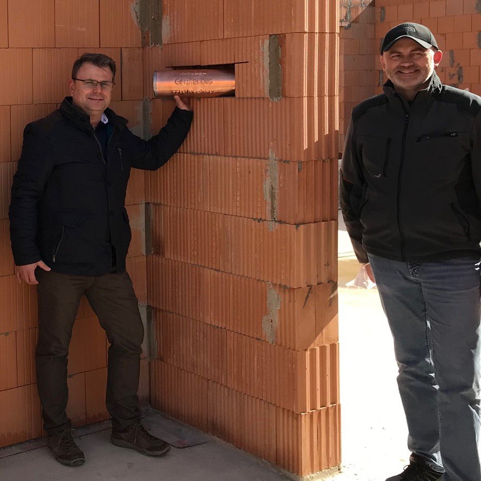 Während die Mauerarbeiten im Erdgeschoss des neuen Gerätehauses in vollem Gange waren setzte Bürgermeister Karlheinz Budnik eine Zeitkapsel / Grundstein in das Mauerwerk im Bereich des zukünftigen Haupteingangs.